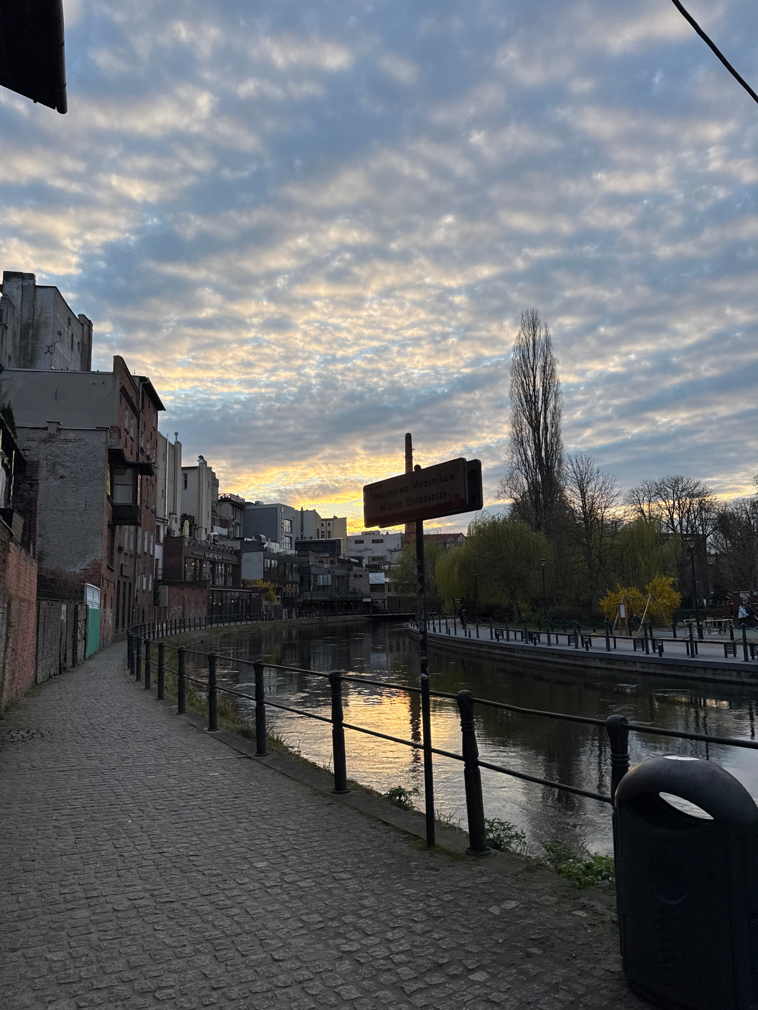 The image depicts a cityscape in Bydgoszcz, Poland, at what appears to be dusk or dawn. A river reflects the orange and yellow hues of the setting or rising sun. Buildings line the riverbank, includin…read more