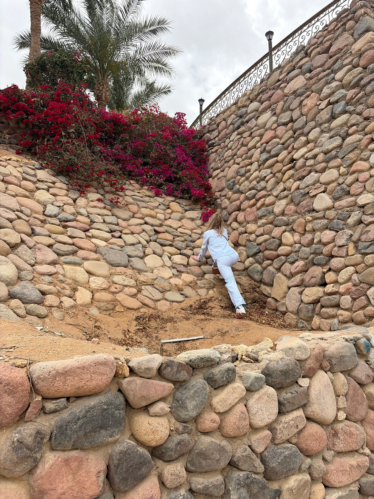 A young woman with blonde hair is bending down towards a wall constructed of rounded stones in Sharm El Sheikh, Egypt. She is wearing a white, pinstriped outfit and white shoes. The wall, made up of v…read more
