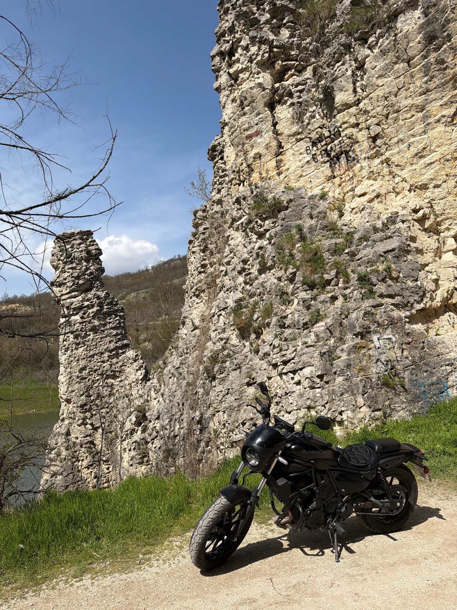 A sideways, daytime shot shows a black motorcycle parked on a gravel road in a narrow gorge. The gorge walls, composed of light-colored, fractured rock, rise sharply on either side, creating a pathway…read more