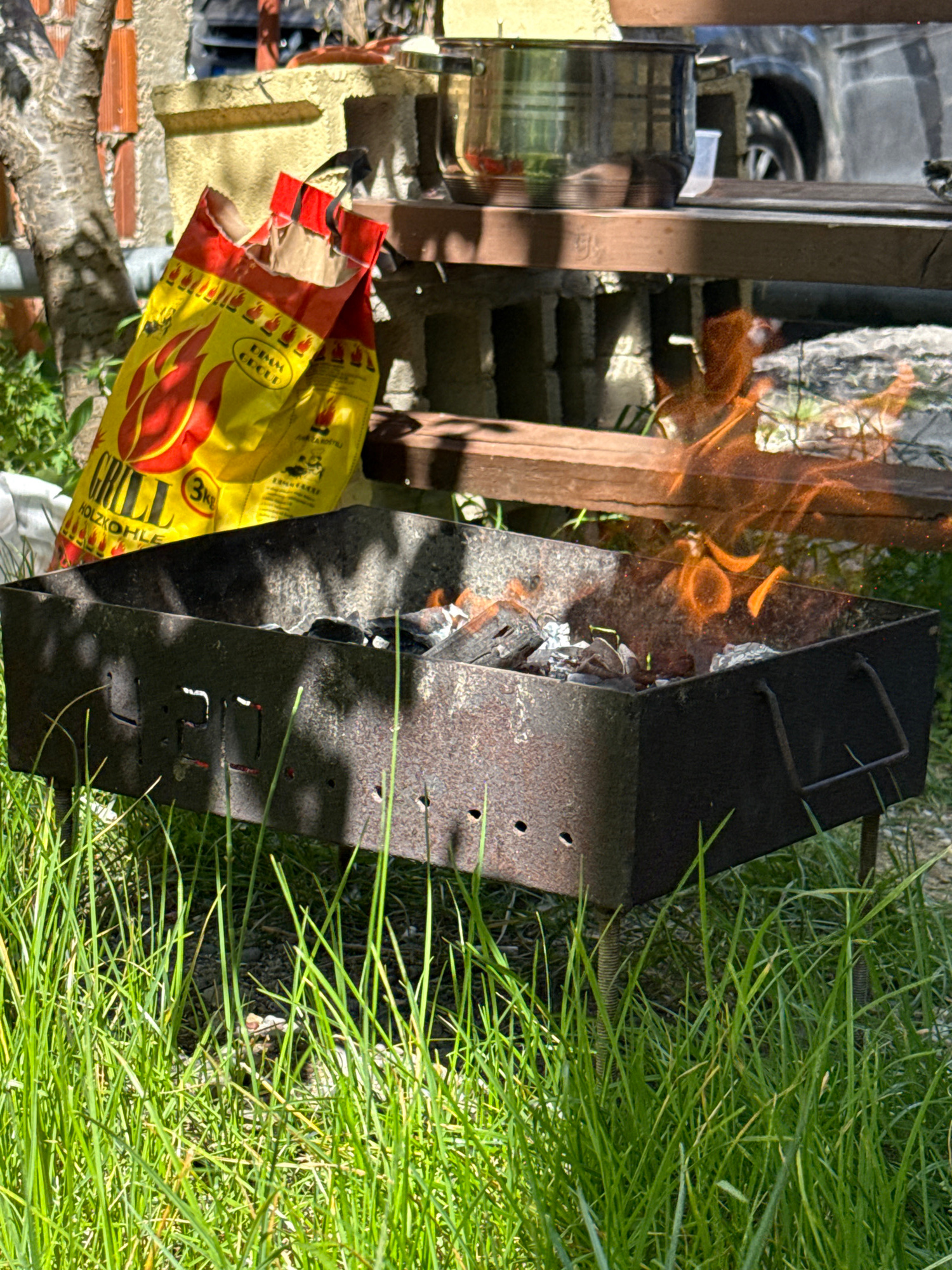 The image depicts an outdoor scene with a charcoal grill in use, situated in a grassy area. The grill is constructed from dark metal with visible signs of wear and tear, containing burning charcoal in…read more