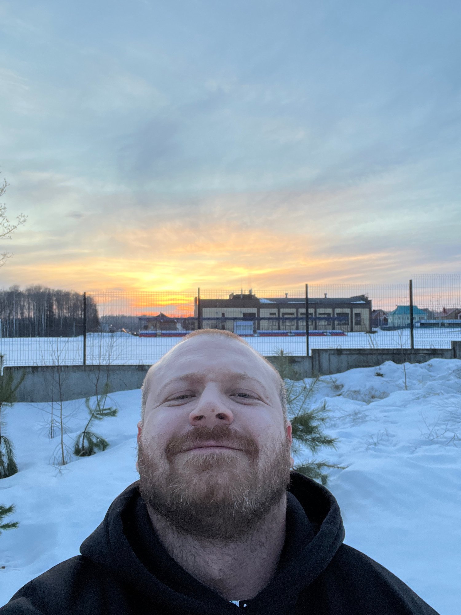 An adult male subject is depicted in a close-up selfie, occupying the lower half of the frame. He has fair skin, a reddish-brown beard, and is wearing a dark hooded sweatshirt. He smiles faintly whileβ¦read more