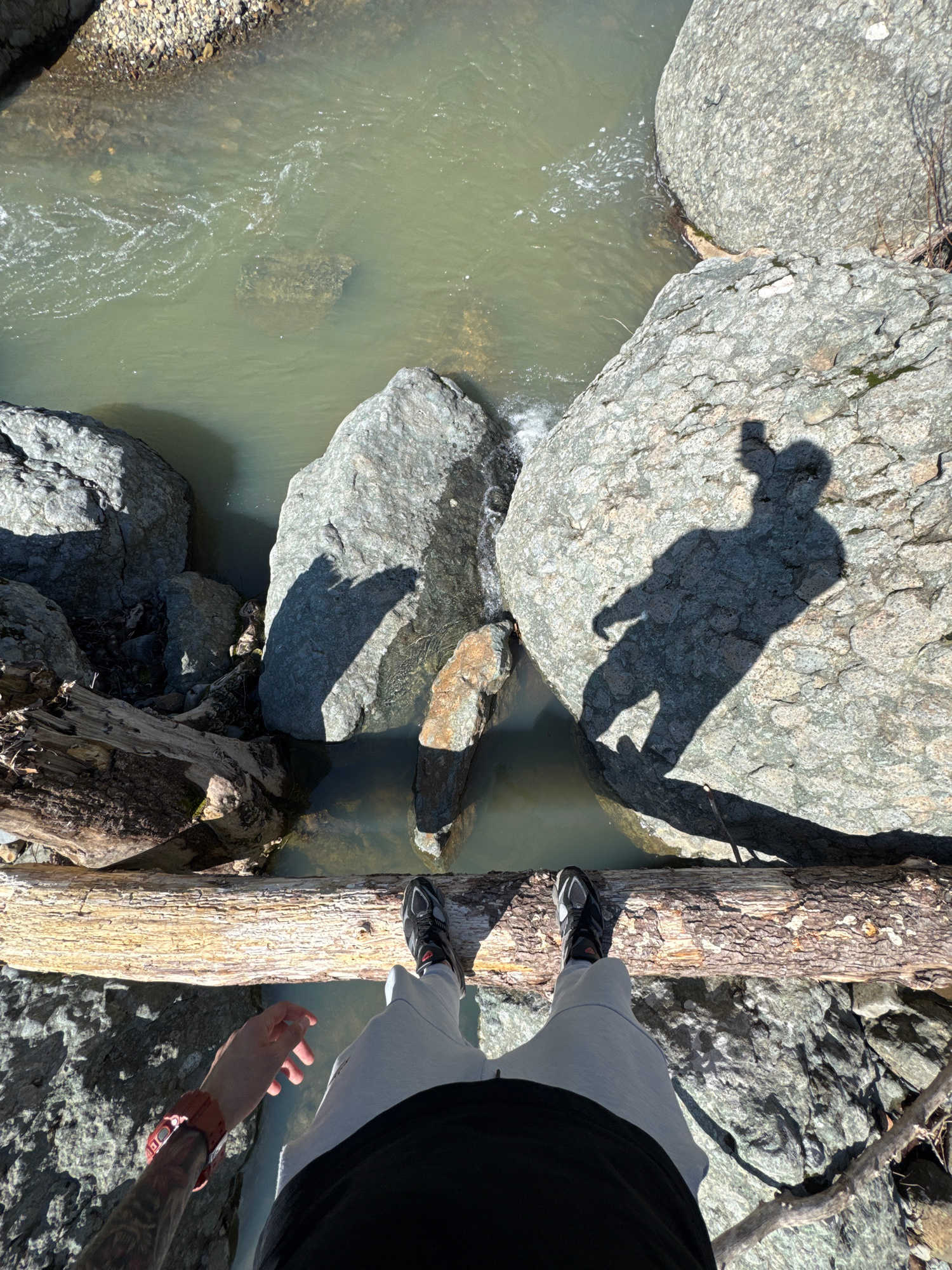 An overhead view depicts a person standing on a natural log bridge spanning a shallow, greenish-brown stream in Fazanovo, Bulgaria. The subject, observed from the mid-torso downwards, wears light greyβ¦read more