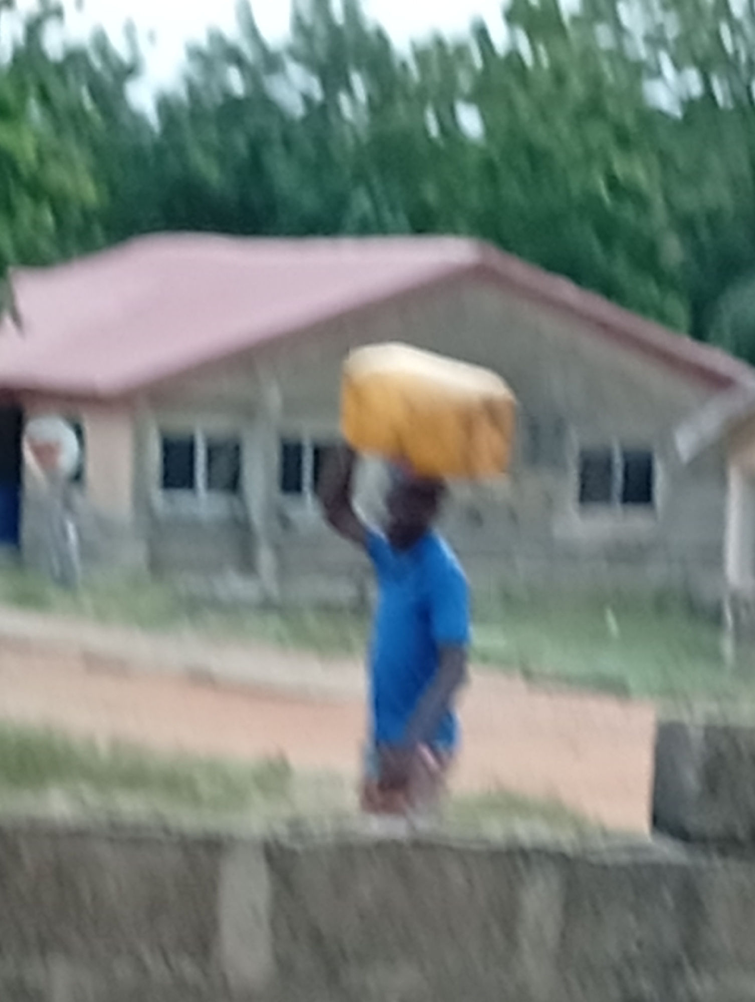 A blurred, low-resolution image depicts a man in Adankolo, Nigeria, carrying a yellow container on his head. He is wearing a blue t-shirt. Behind him is a one-story building with a red roof and severa…read more