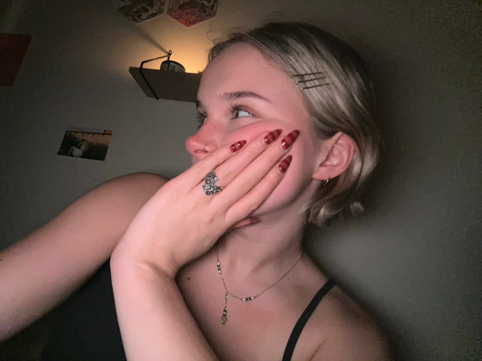 A young woman lies on her side, face partially obscured by her hand with a silver ring. Her hair is blonde with dark roots, adorned with three bobby pins. She wears a black top with thin straps and a…read more