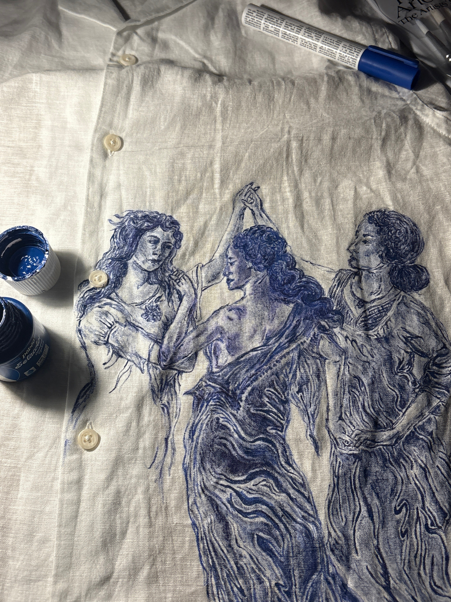The image shows a white linen shirt with a blue pen drawing of three female figures resembling Botticelli's "Primavera." The shirt has visible buttons. A blue marker and a jar of blue paint are positi…read more