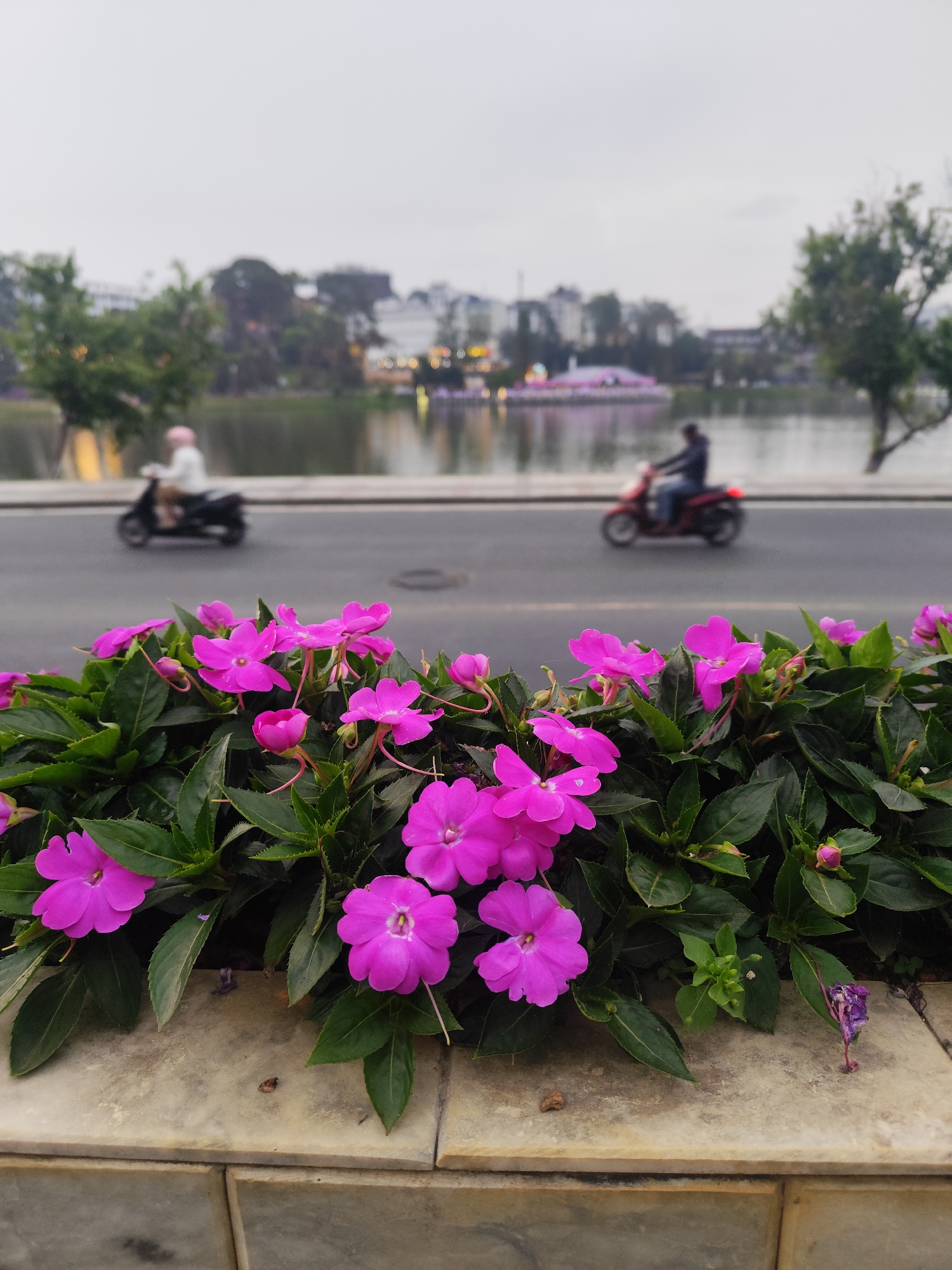 The image presents a vibrant scene set in Da Lat, Vietnam, characterized by a distinct layering of elements from foreground to background. In the immediate foreground, a dense cluster of bright pink/m…read more