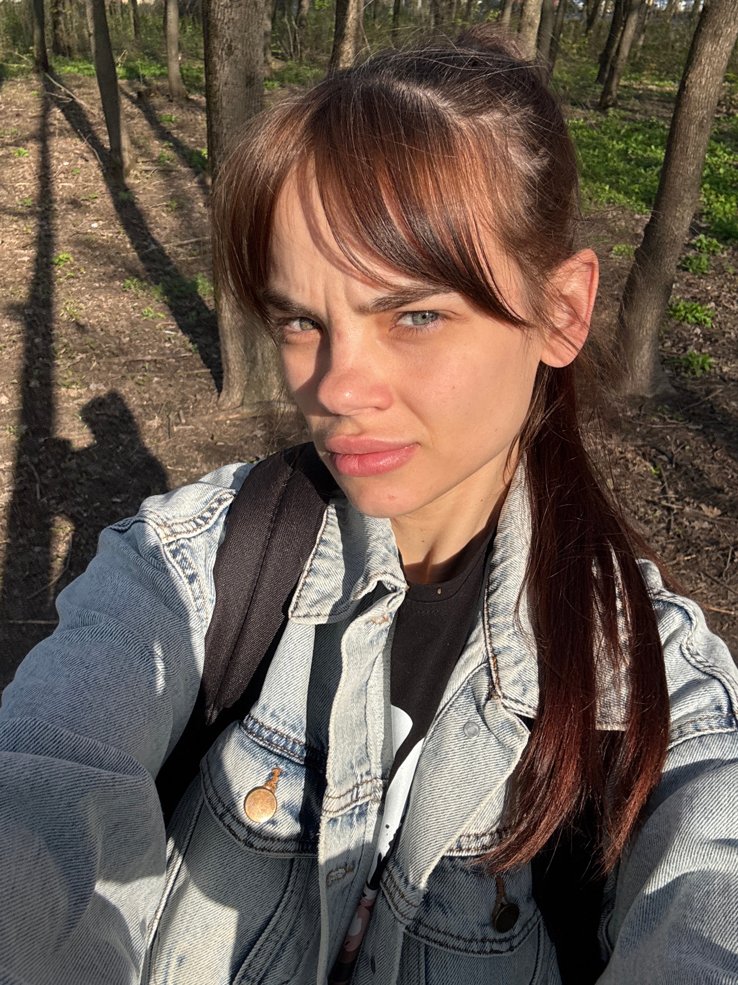 A close-up, slightly tilted selfie captures a young woman outdoors in what appears to be a park or forest in Rostov-on-Don, Russia. She is looking directly at the camera with a neutral expression, her…read more