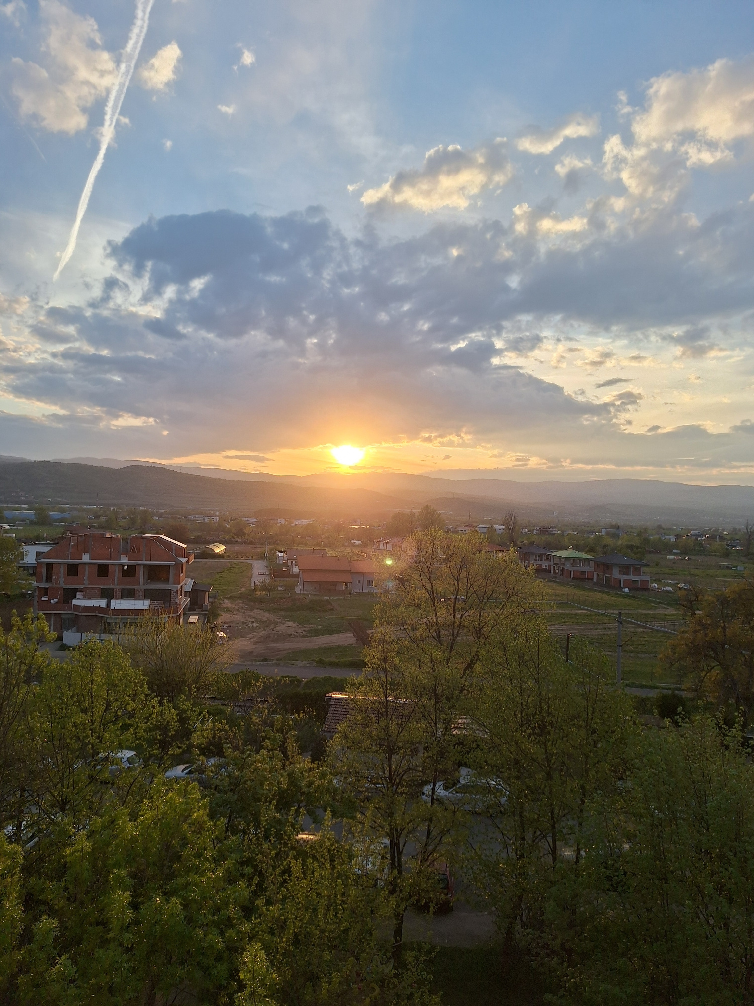 This image captures a vibrant sunset over a semi-urban landscape, likely taken from an elevated vantage point in Blagoevgrad, Bulgaria. The central subject is the setting sun, a brilliant golden orb…read more