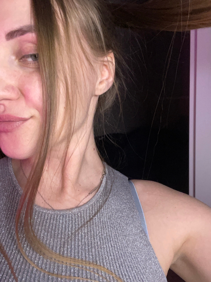 A woman's tilted face is visible with a silver, ribbed top. Her light brown hair partially covers her face. Her left eye is open and looking downwards, while her lips are closed. Her complexion is fai…read more