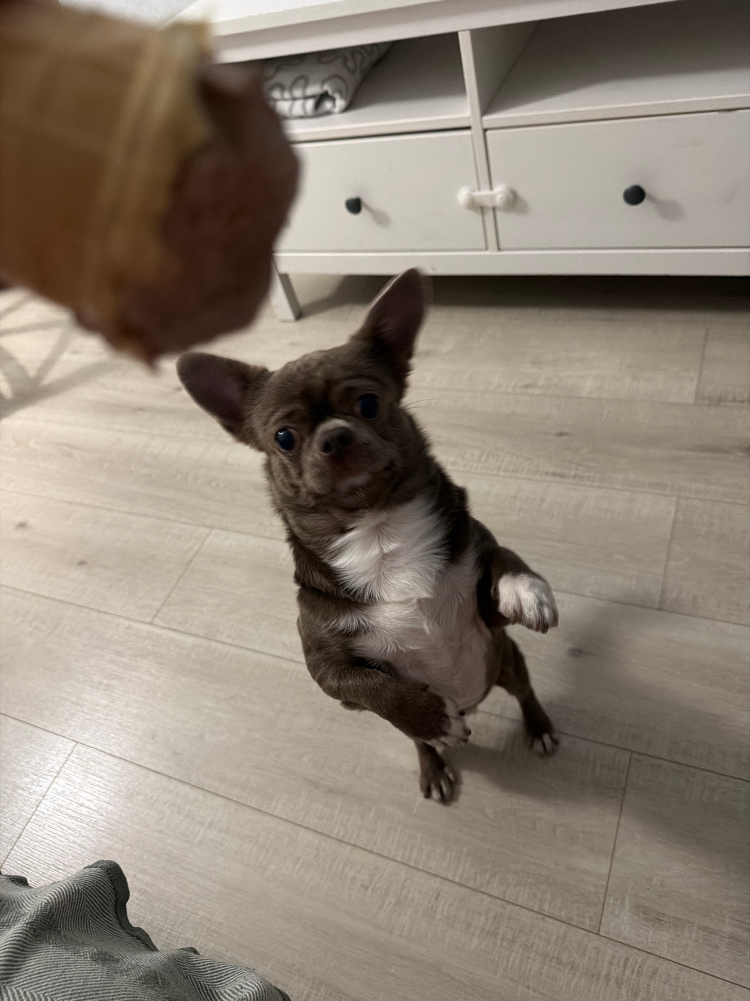 A brown and white chihuahua is lying on its back on a light-colored wood floor. The dog is looking up, seemingly at an ice cream cone held in the lower left of the frame. A white cabinet with drawers…read more