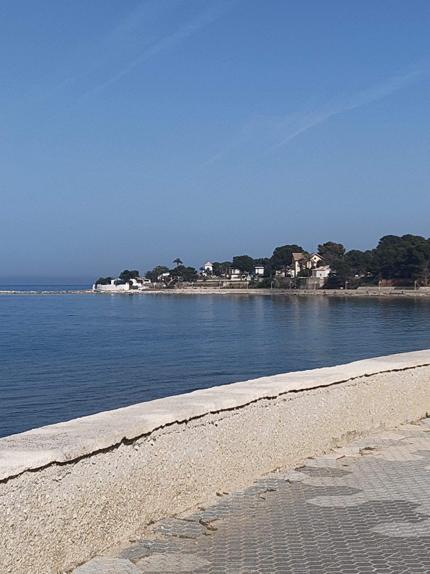 The image depicts a coastal scene in Dénia, Spain, showing a tranquil bay under a clear, blue sky. The foreground features a weathered, stone wall running horizontally across the frame. Adjacent to th…read more