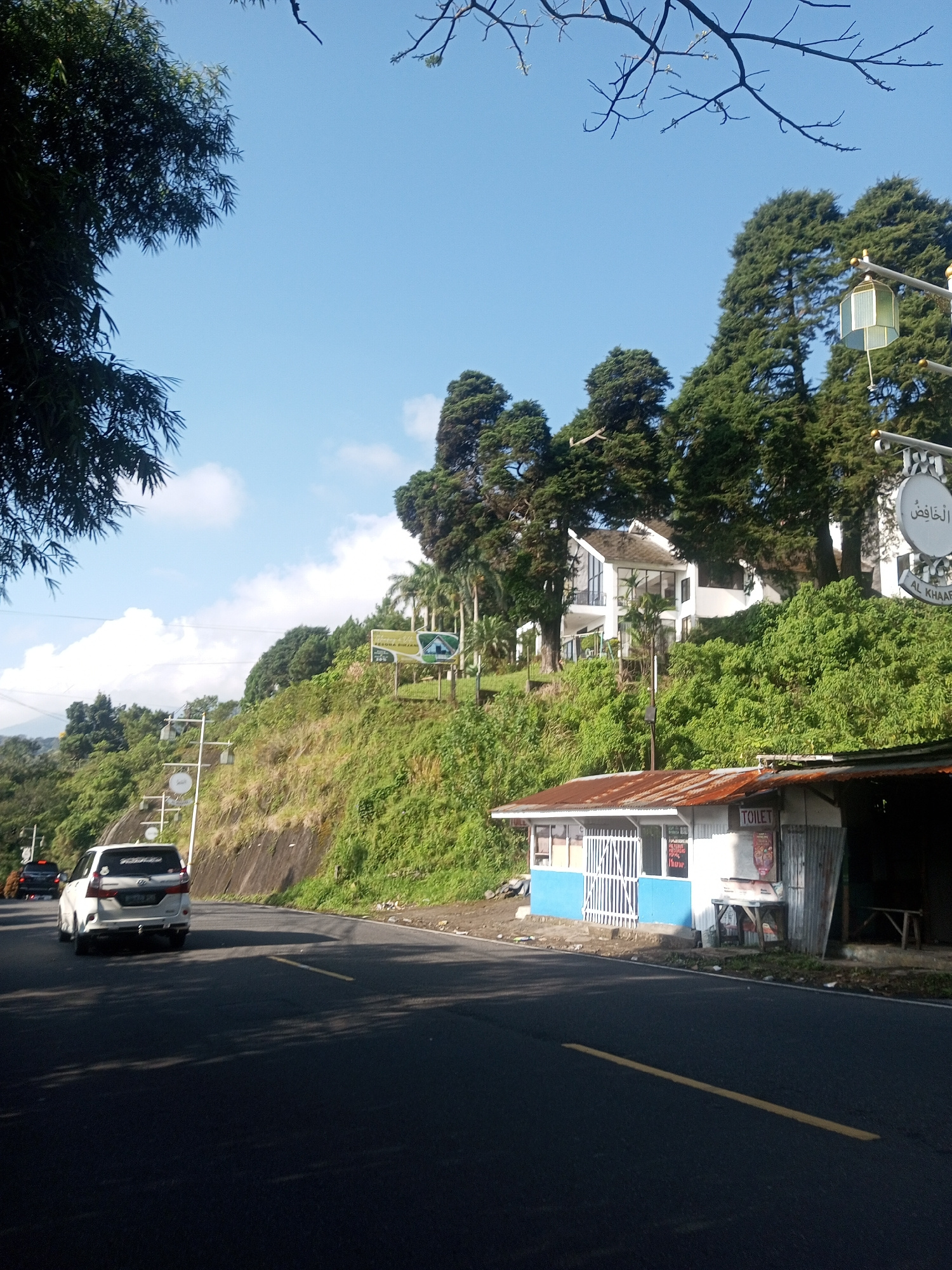 The image depicts a roadside scene, likely on the outskirts of a city or in a rural area. A paved road with a yellow centerline stretches into the distance. A white vehicle is traveling on the road, a…read more