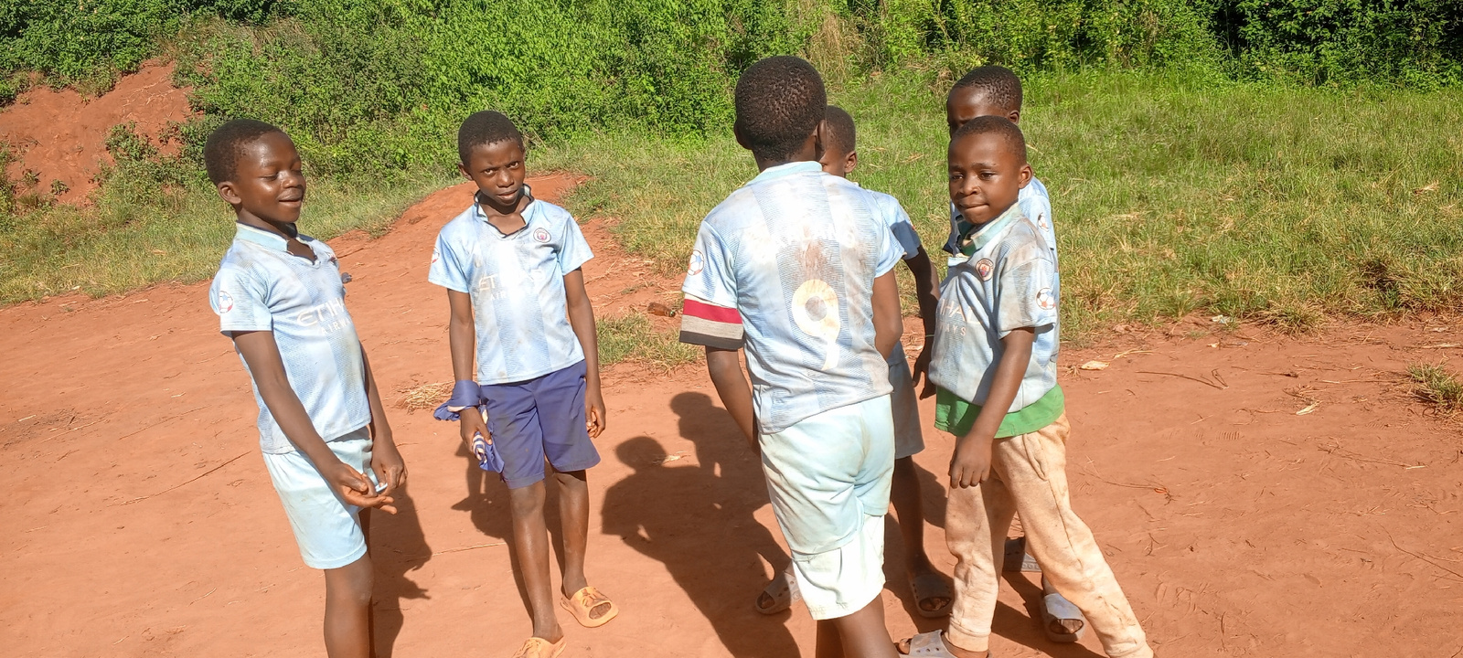 In Ngalula, Democratic Republic of the Congo, a group of five young boys are gathered on a dirt path near greenery. They are wearing matching light blue soccer jerseys with "City Airways" logos. Their…read more