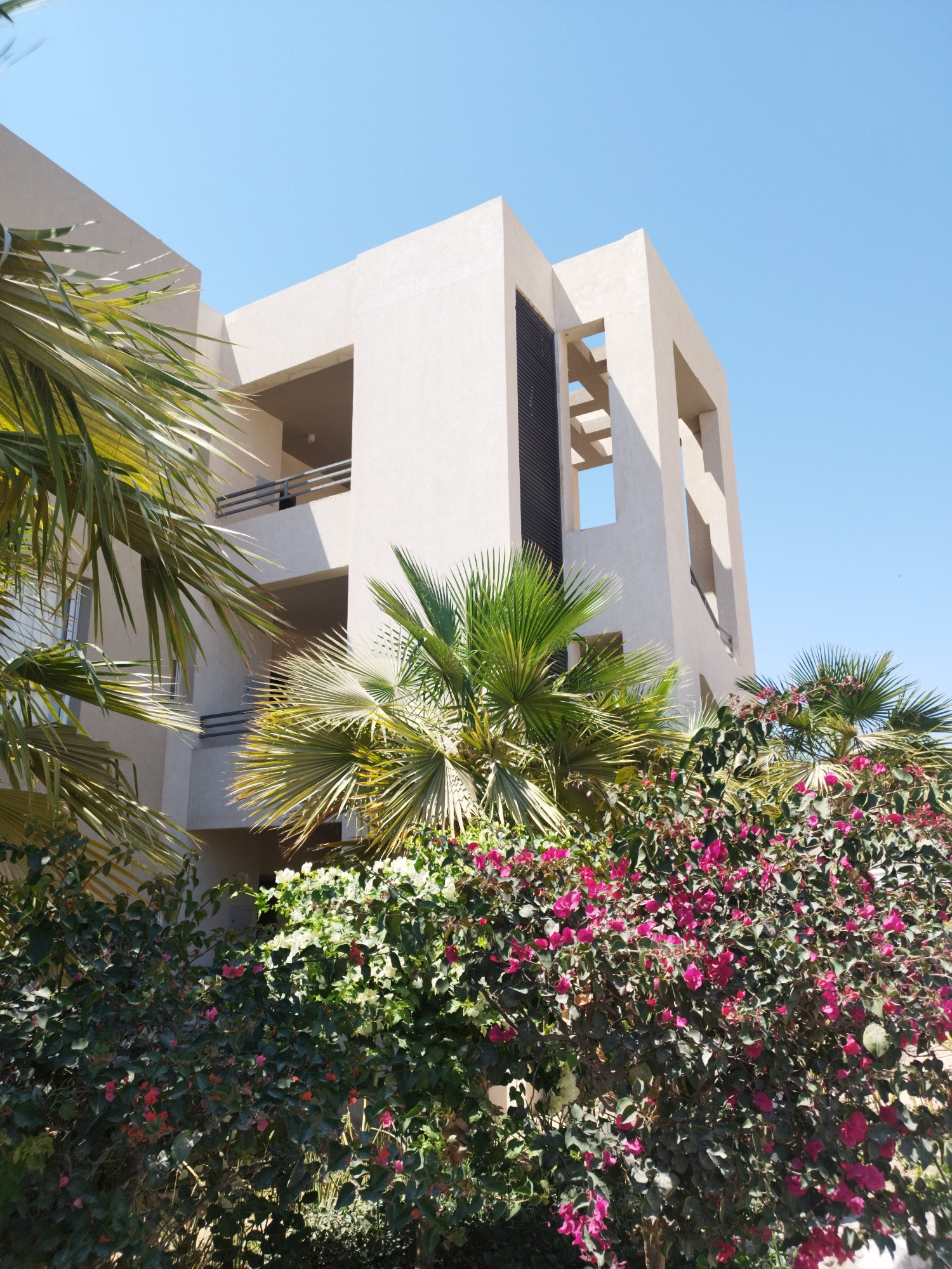 The image depicts a building with a modern architectural style located in Ras Abu Soma, Egypt, under a clear blue sky. The building is light-colored with distinct sections, including balconies and a t…read more