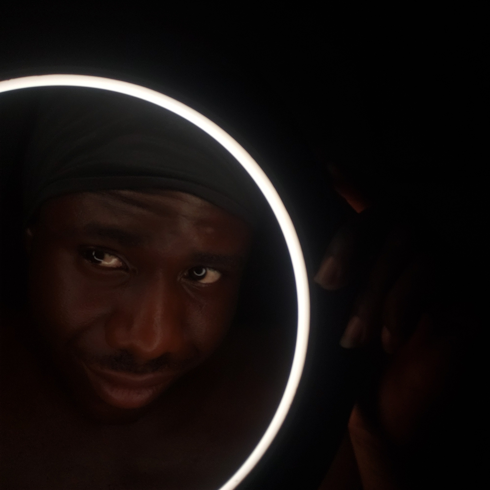 A close-up, tilted photograph shows a person's face framed by a ring light against a dark background. The person has dark skin, dark eyes, and is wearing a dark head covering. Their expression appearsβ¦read more