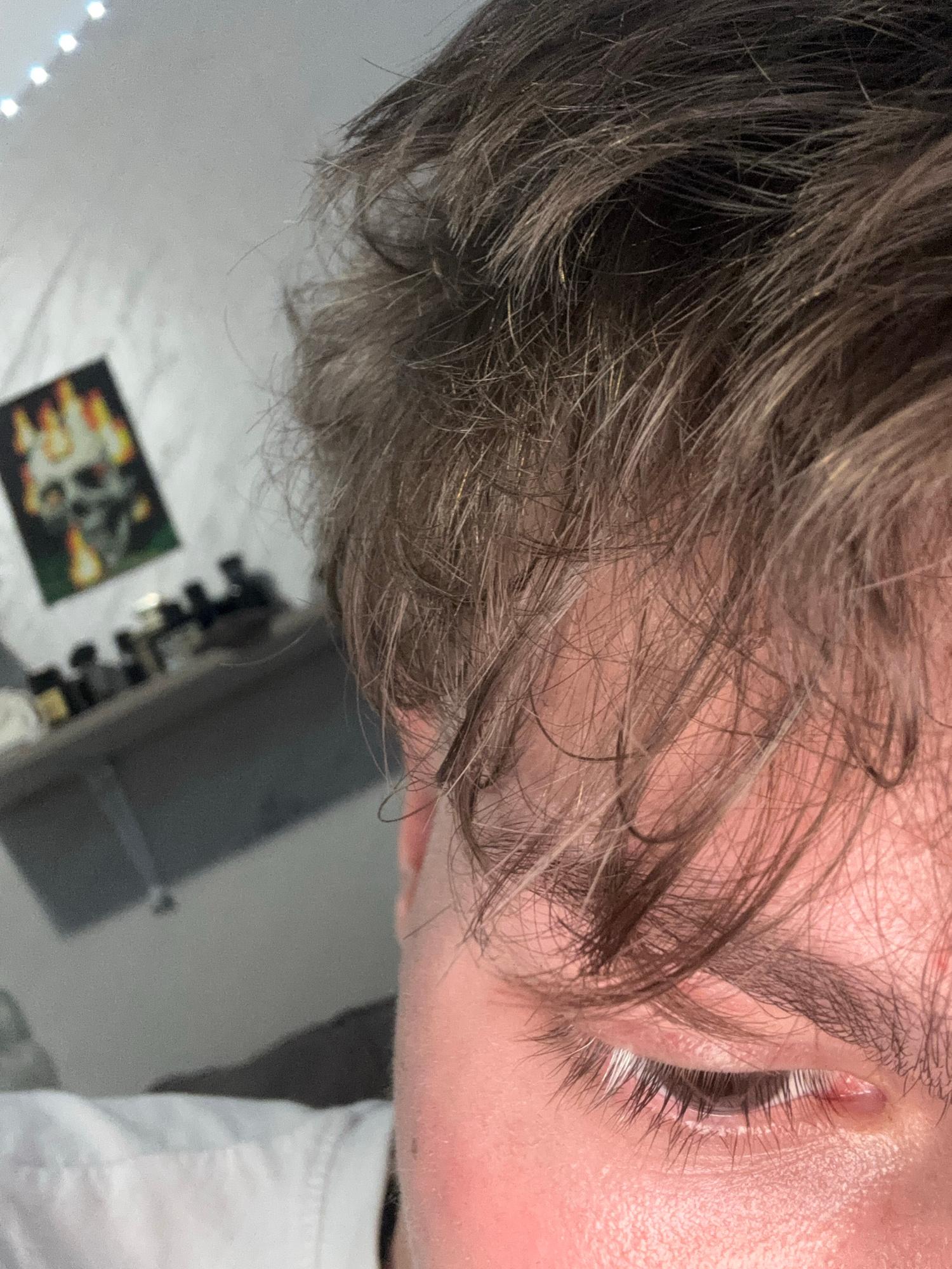 A close-up, tilted view of a person's face and hair. The person has light brown hair and fair skin. One eye is visible, with dark eyelashes. The person is wearing a white shirt. In the blurred backgro…read more