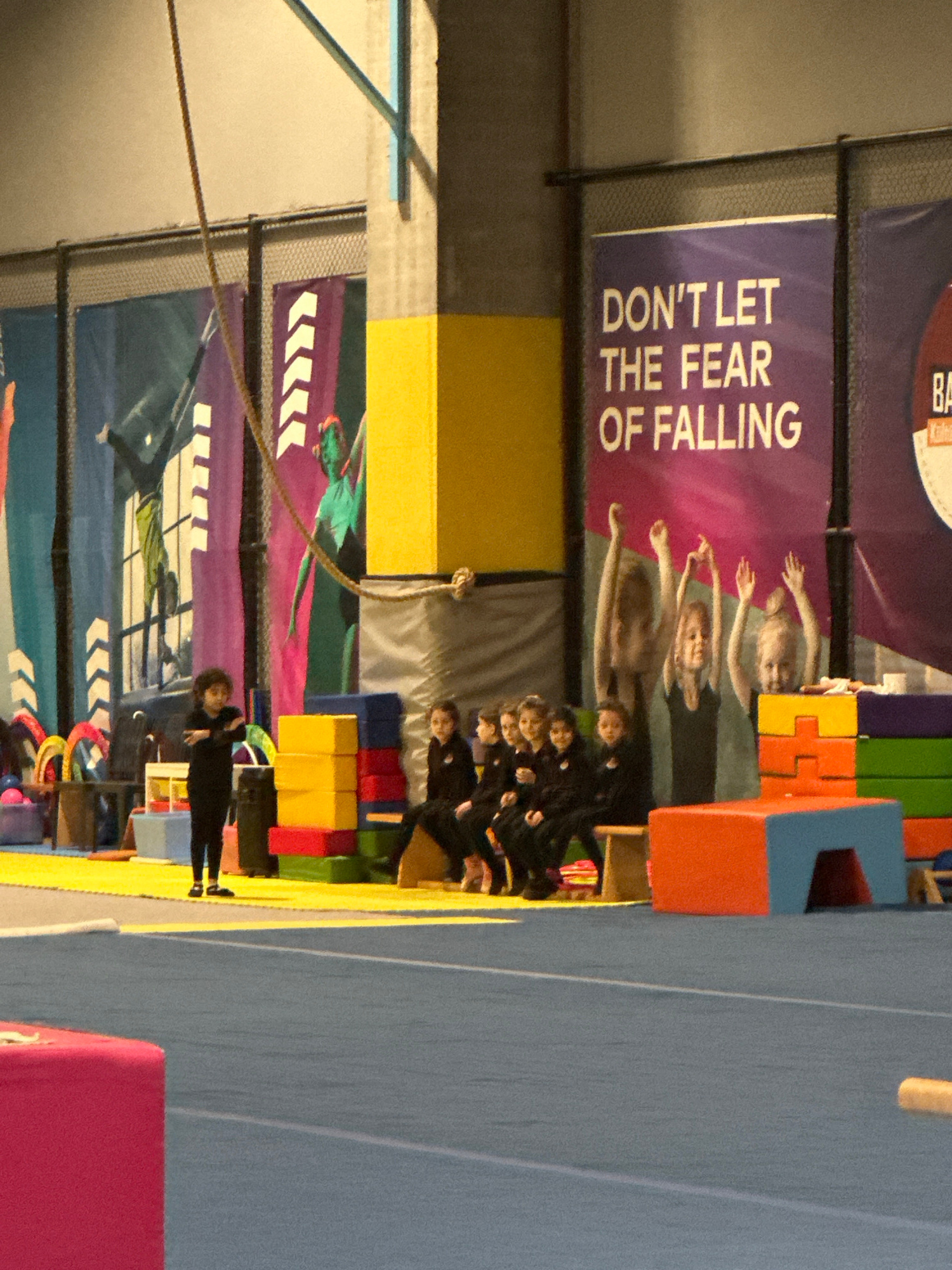The image shows an indoor gymnastics facility, possibly in Esenyurt, Turkey (though this cannot be confirmed from the image alone). A group of children dressed in black are seated, facing the camera,…read more