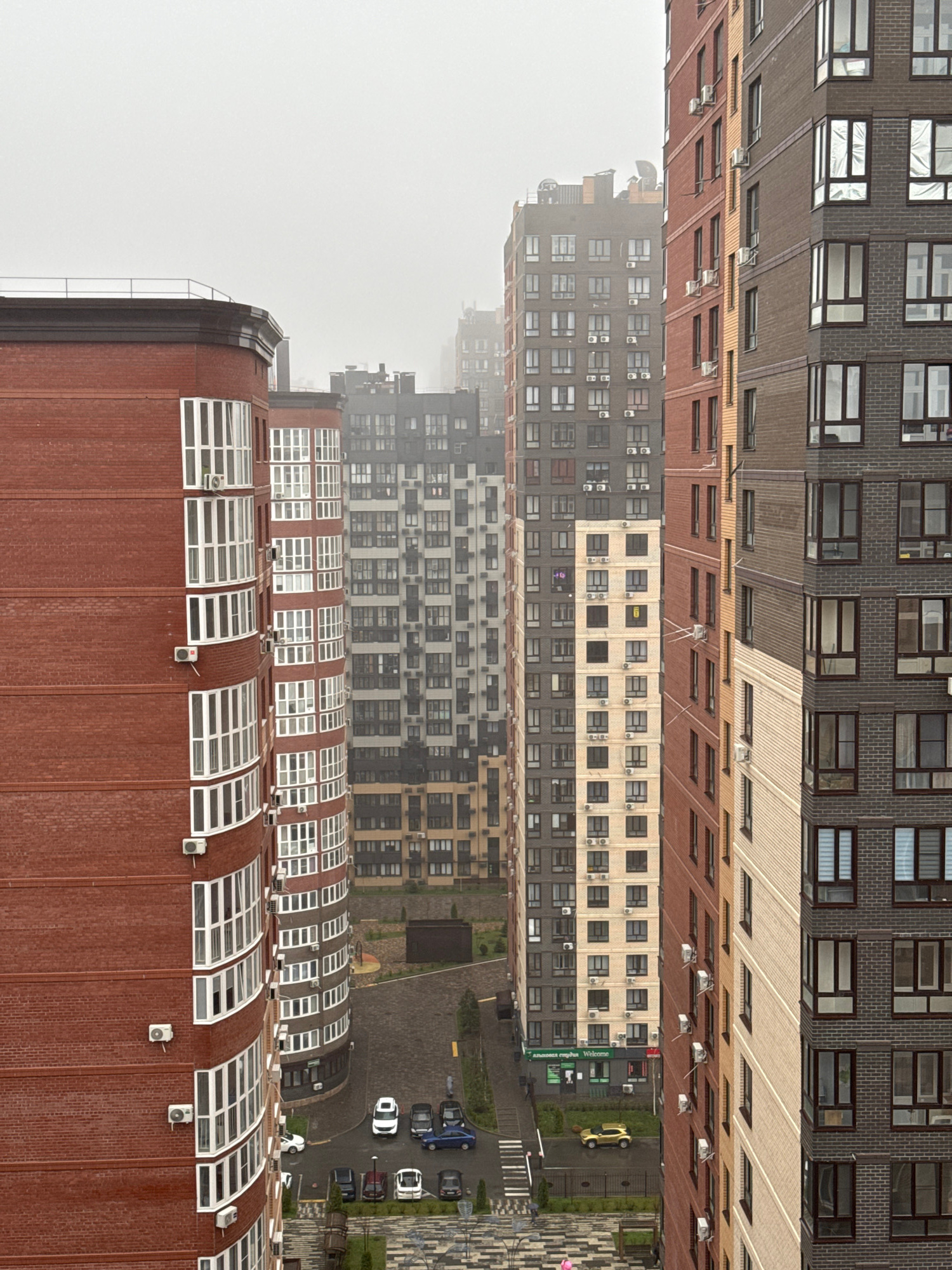 The image shows an urban view between tall buildings in Ovoshchnoy, Russia, likely taken from a high vantage point. The buildings are varied in color and architectural style, constructed of brick and…read more