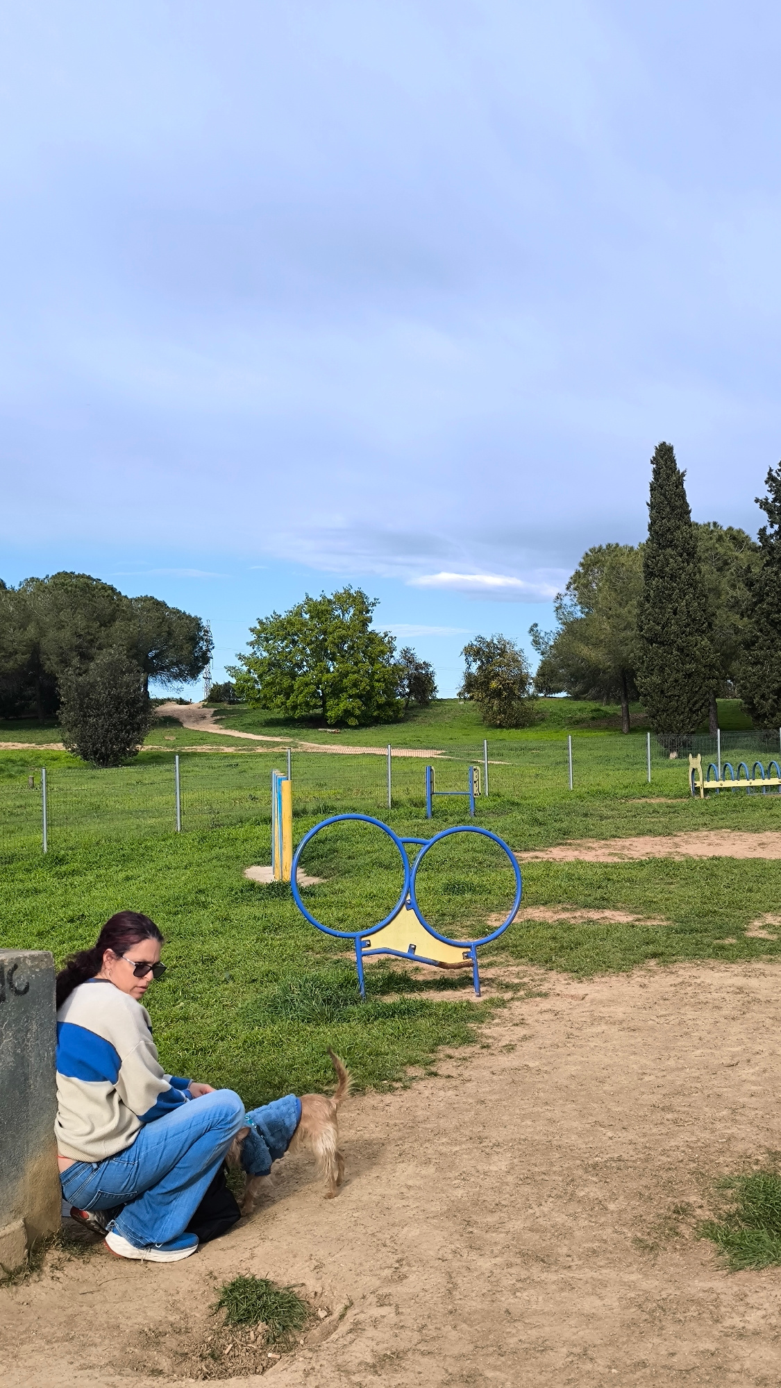 The image depicts a woman sitting next to a concrete structure with a small dog in a park in Ripollet, Spain. She is wearing jeans, a sweater with a blue stripe, and sunglasses. The dog is standing on…read more