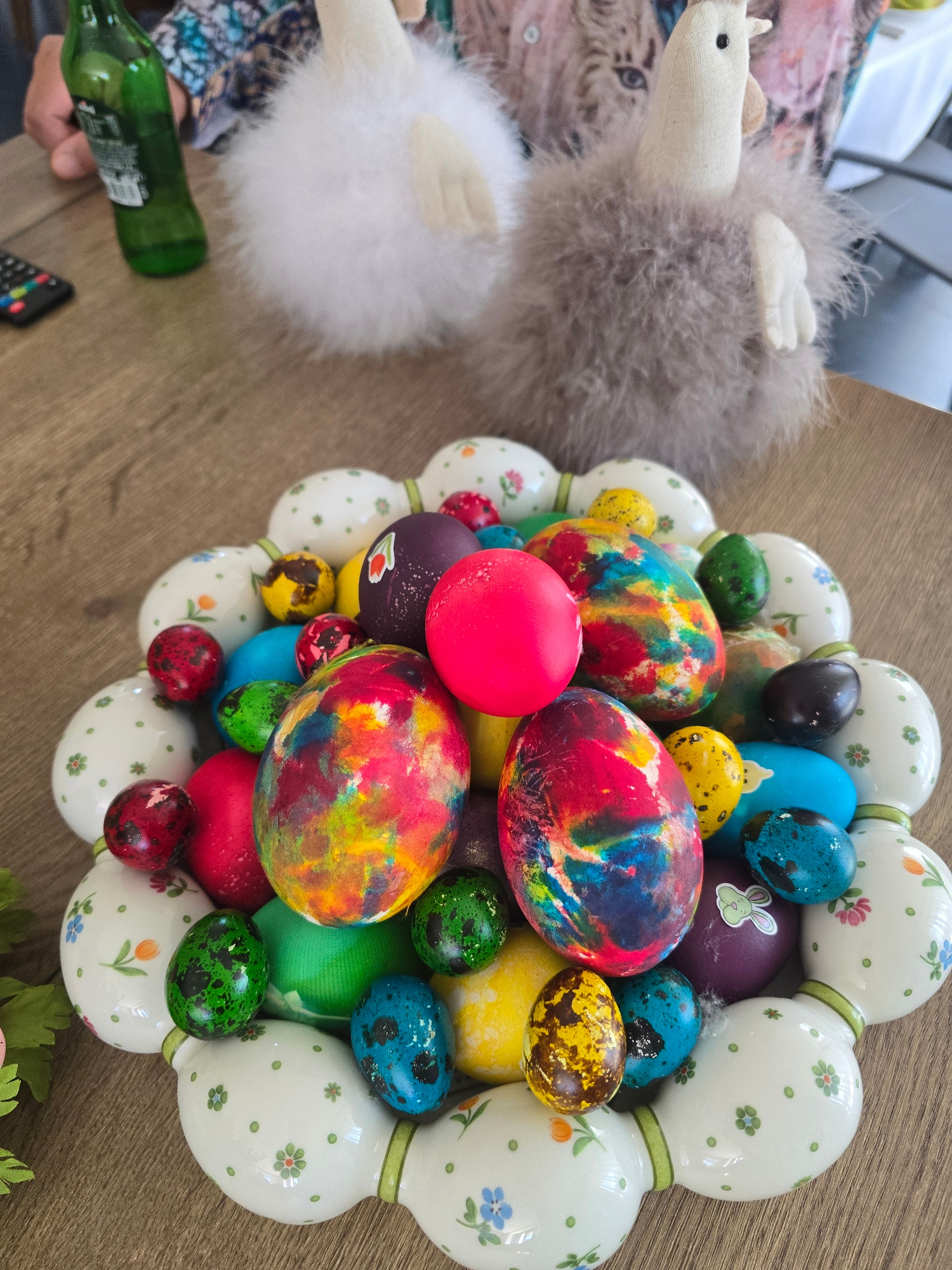 The image shows a wooden table with an Easter wreath made of decorative eggs. The wreath is composed of white eggs with floral patterns around the edge, and the center is filled with colorful painted…read more