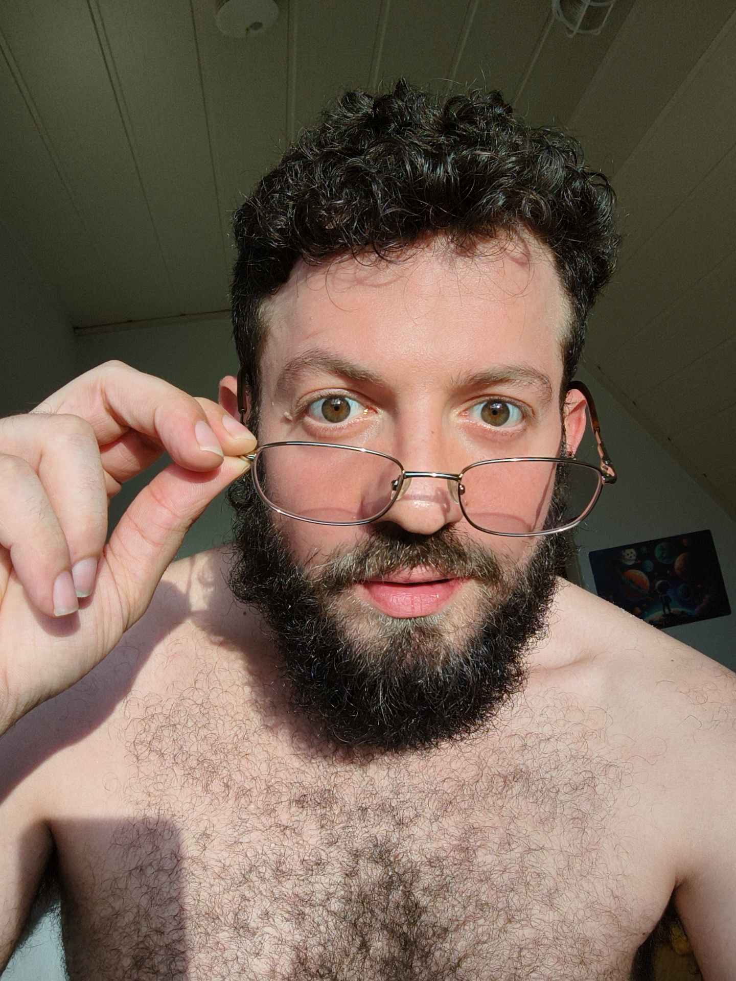 A shirtless man with dark curly hair and a full dark beard is holding a pair of eyeglasses, partially obscuring his face. He appears to be indoors, with a slanted ceiling visible in the background. A…read more