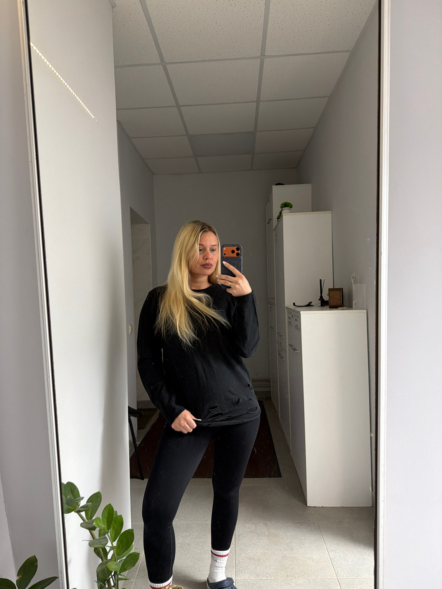 A woman stands in front of a mirror taking a selfie. She is wearing a black hoodie and black leggings with white and red striped socks. She has long blonde hair. The background shows a bathroom or kit…read more