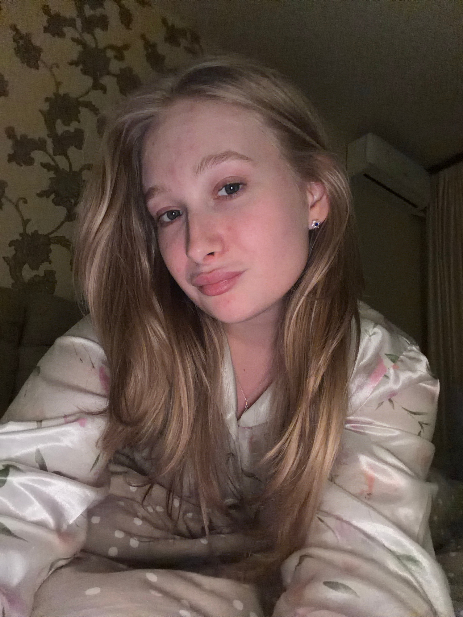A pale-skinned individual with blonde hair is lying down on a patterned bed, wearing light-colored floral-patterned pajamas. The individual is facing the camera. A piece of furniture, possibly an air…read more
