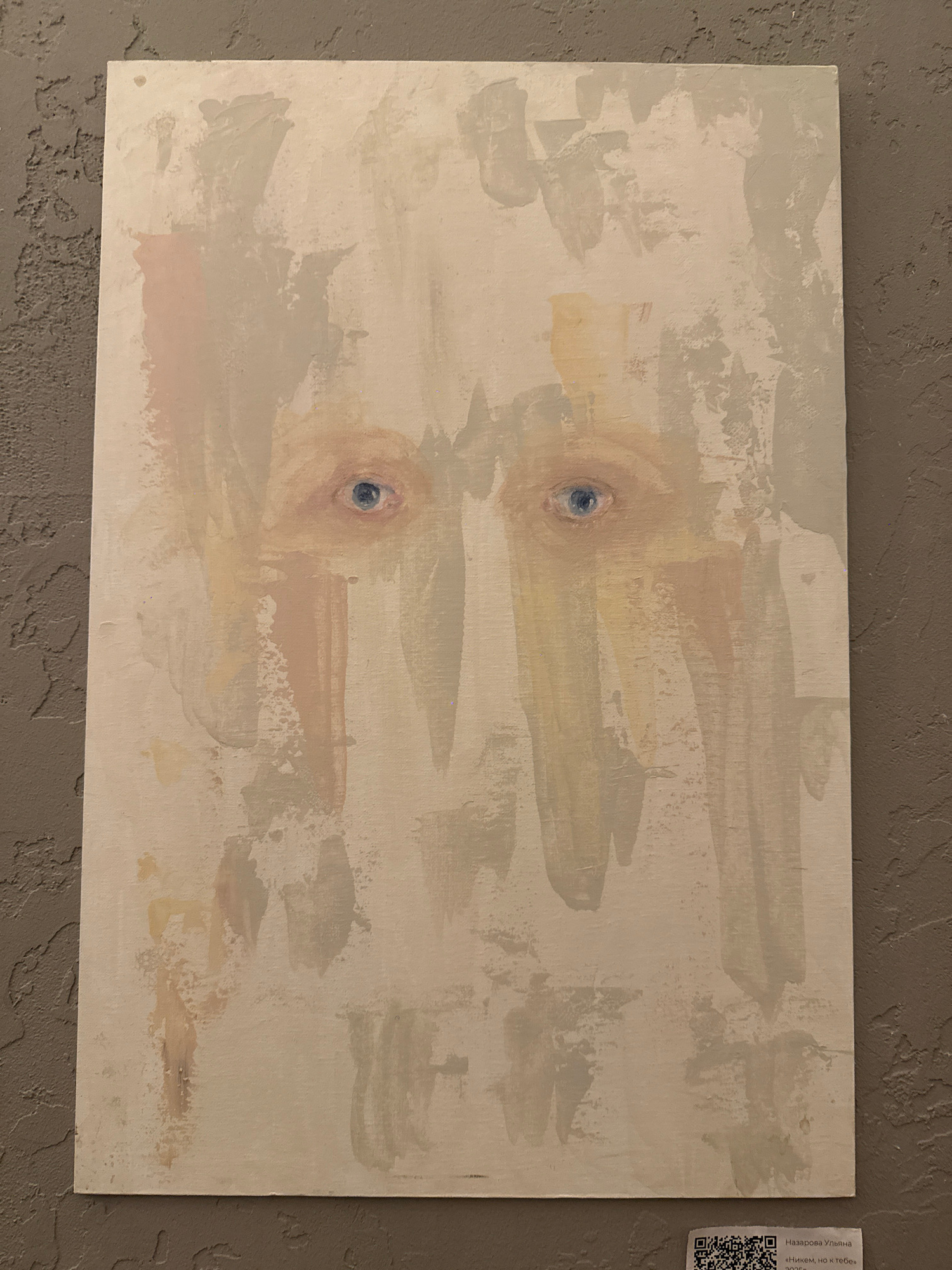 The image shows a painting on a wall. The painting depicts two stylized eyes with blue pupils. The painting is done in a neutral color palette with broad brushstrokes. The wall is textured and painted…read more