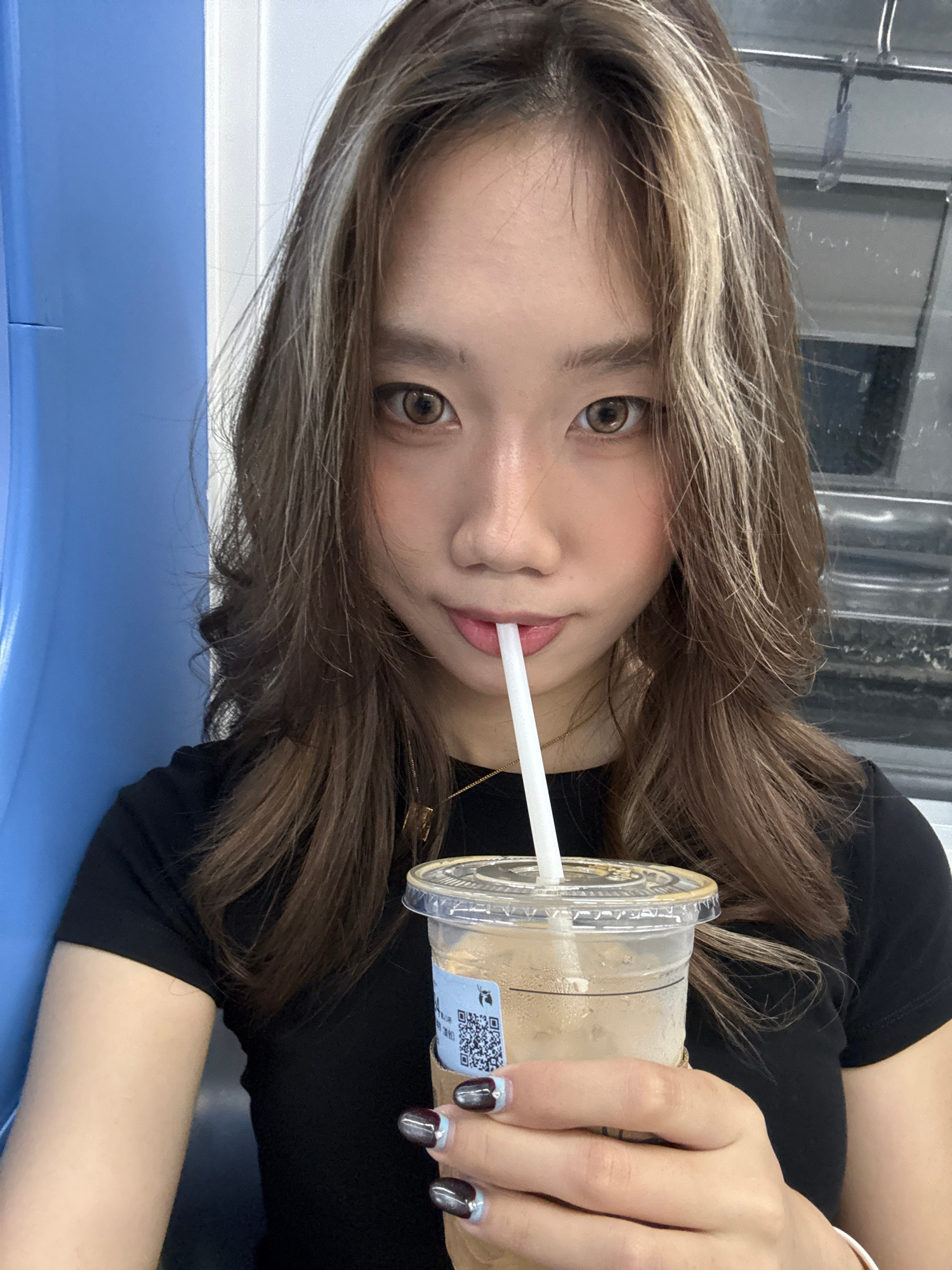 A person with light brown hair with blonde highlights is holding a plastic cup with a straw, possibly a beverage, while sitting on a blue surface. They are wearing a black top and have manicured nailsβ¦read more