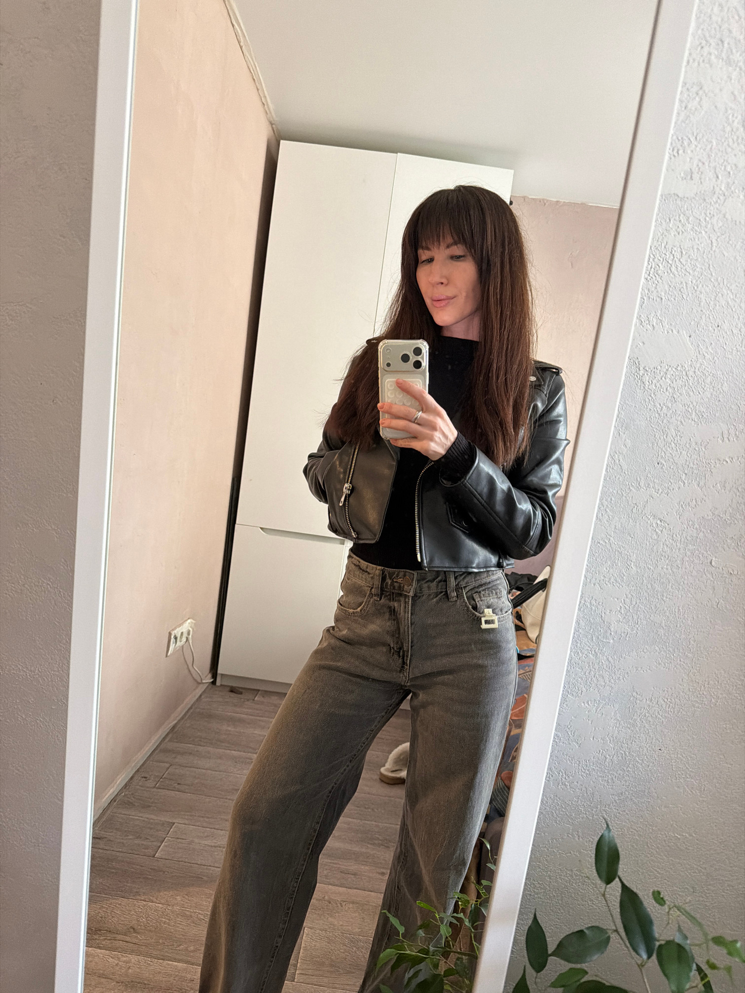 A person is taking a mirror selfie indoors. The person has long brown hair with bangs and is wearing a black leather jacket over a black top, and gray jeans. They are holding a smartphone with a clear…read more