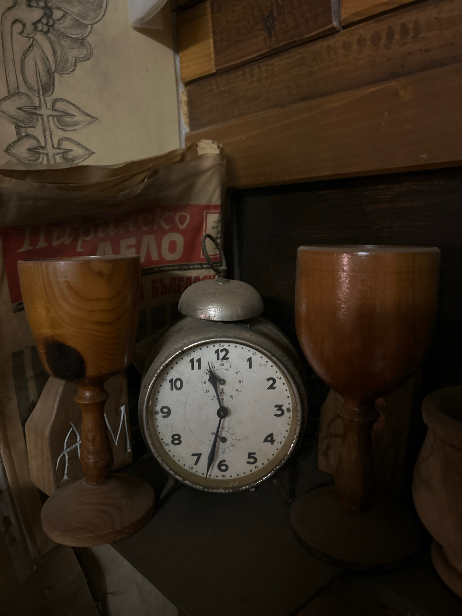 This media file presents a close-up, static shot of a collection of old objects arranged on wooden surfaces, likely within a workshop or storage area. The image is oriented vertically. The central su…read more