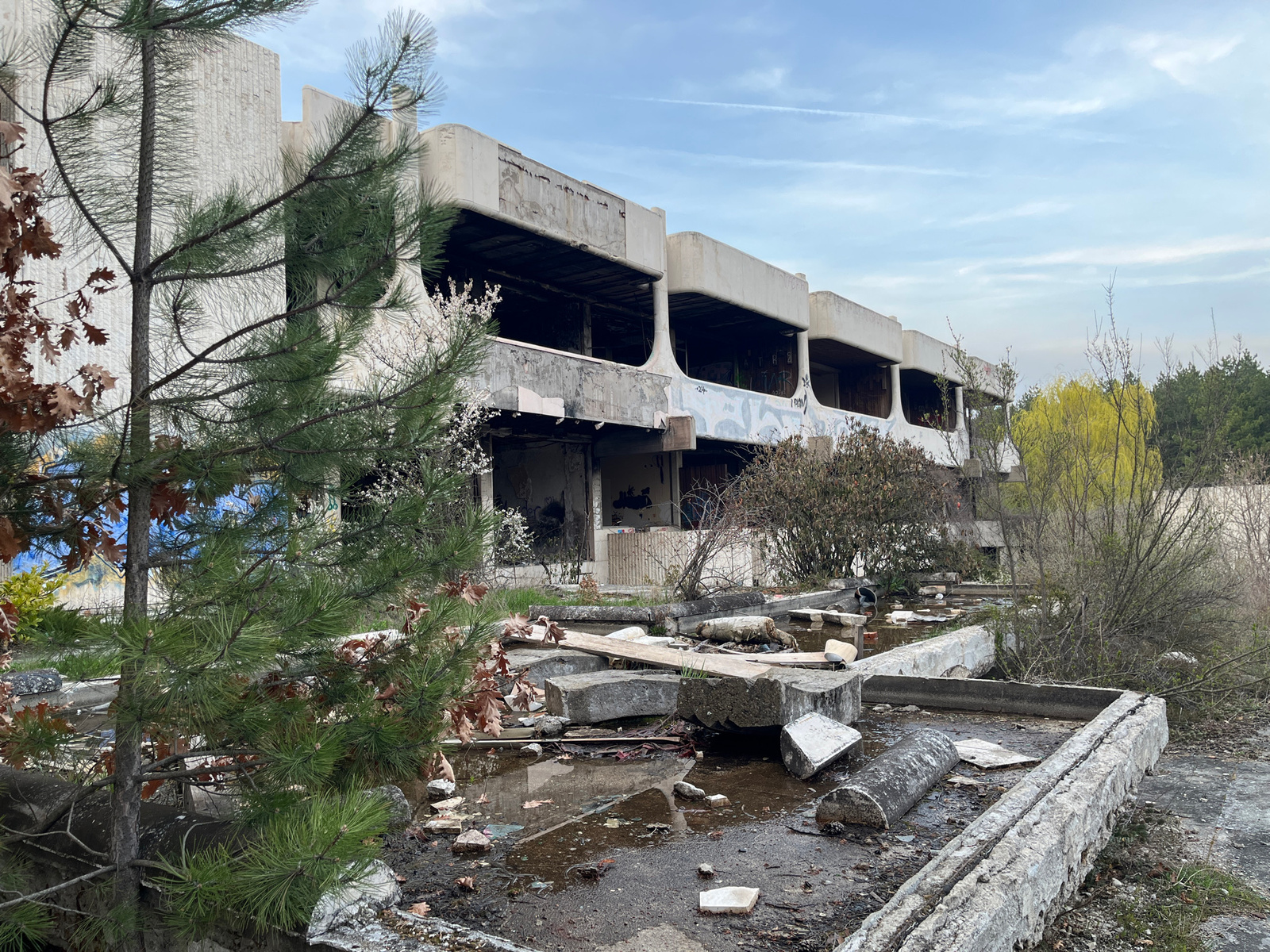 The image shows a deteriorated two-story building, likely abandoned, in what appears to be an overgrown or neglected area. The architectural style of the building suggests a potentially modernist desi…read more