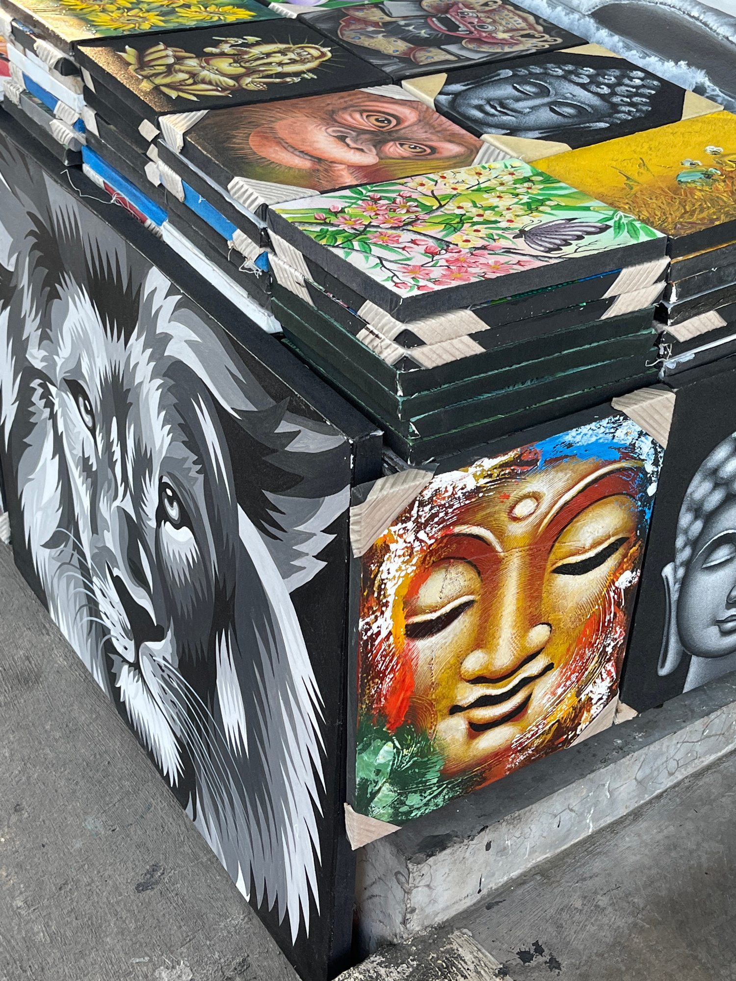 The image shows a stack of framed artworks in what appears to be an outdoor setting. The artworks include paintings of a wolf in grayscale, Buddha faces in various styles and colors, an orangutan, flo…read more