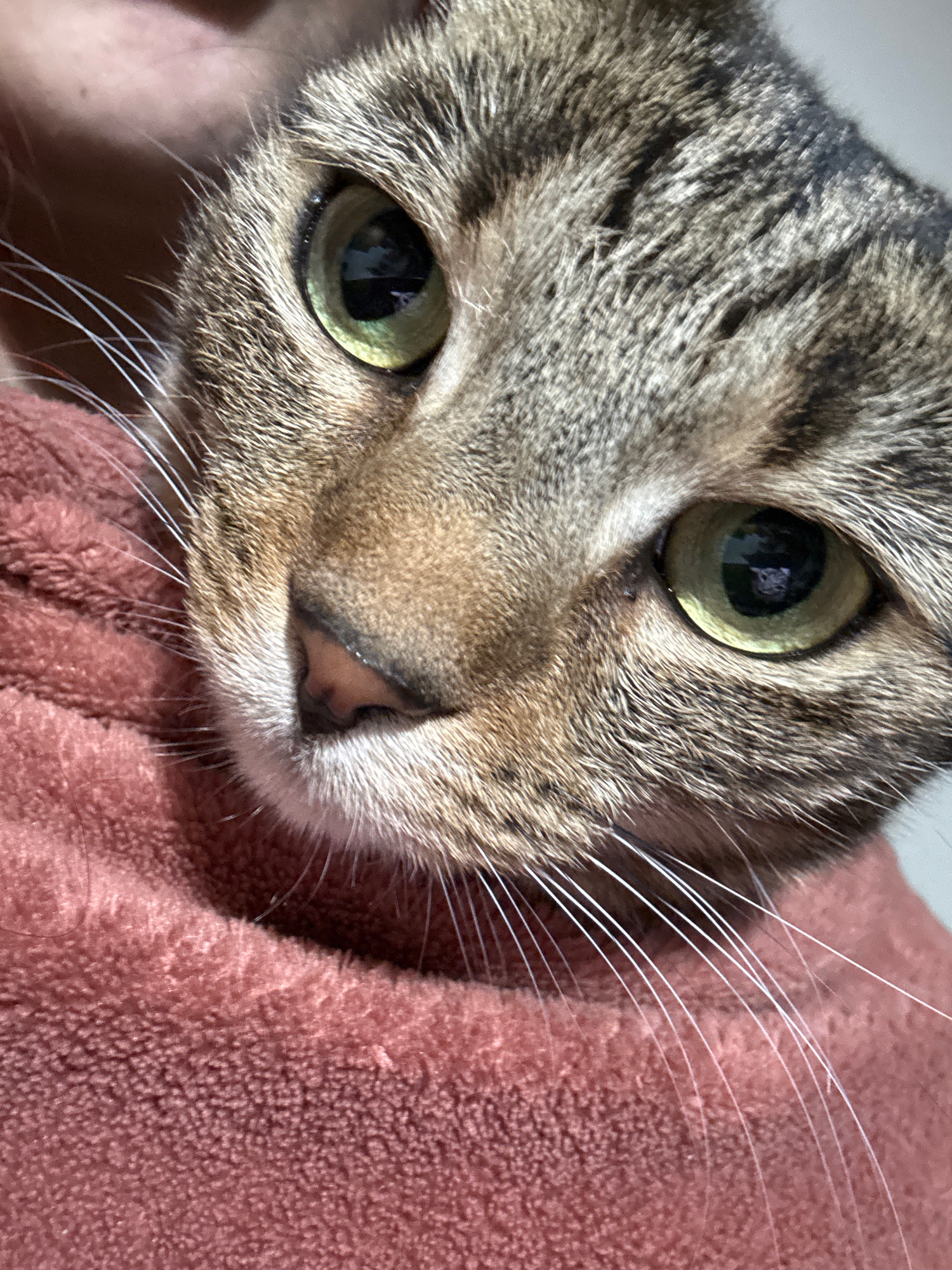 A close-up shot focuses on the face of a tabby cat. The cat has green eyes and a pink nose. Its whiskers are white and prominent. The cat is lying on a pink, textured surface. There is no indication o…read more