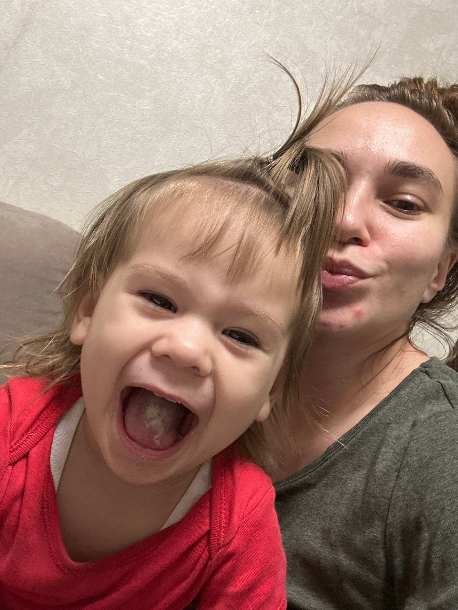 A close-up, angled shot features a woman and a young child. The woman, positioned in the background, has light skin and dark hair pulled back. She is wearing a gray shirt and her expression is a sligh…read more