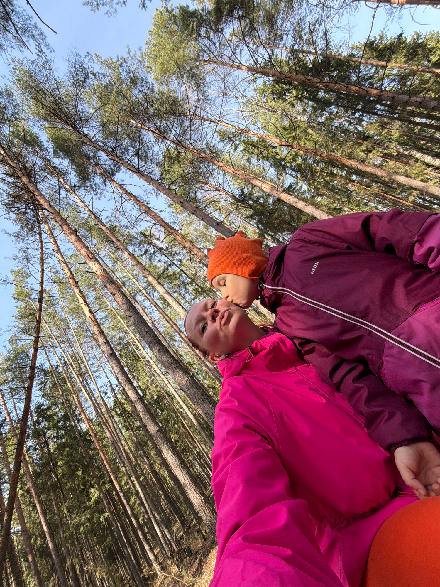 This image, captured in a forest in Chaikovsky, Russia, shows two individuals in a moment of affection, viewed from a low, upward-looking perspective. The original image is rotated 90 degrees counter-…read more