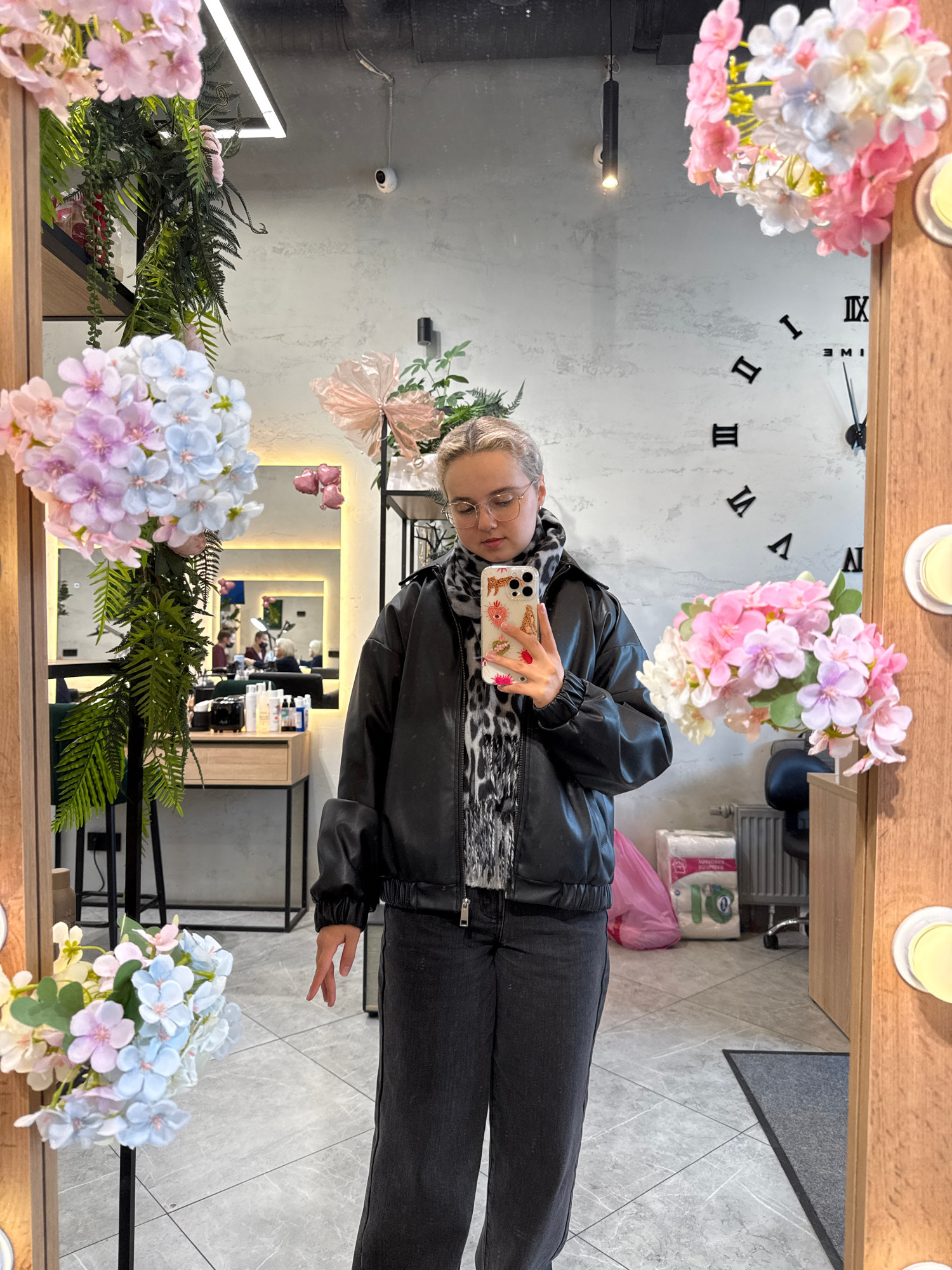 The image shows a woman taking a selfie in front of a mirror. The mirror is framed with wooden panels and decorative artificial flowers. Behind the woman in the mirror's reflection is what appears to…read more