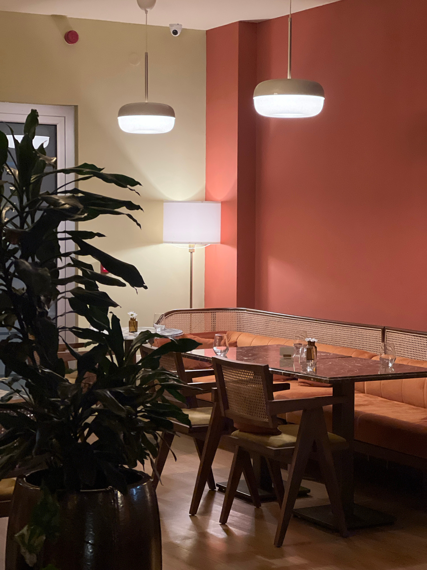 The image shows an interior space, possibly a restaurant, with a red ceiling and yellowish walls. The space is lit by modern, rounded rectangular light fixtures. A dining table with a glass top and ra…read more
