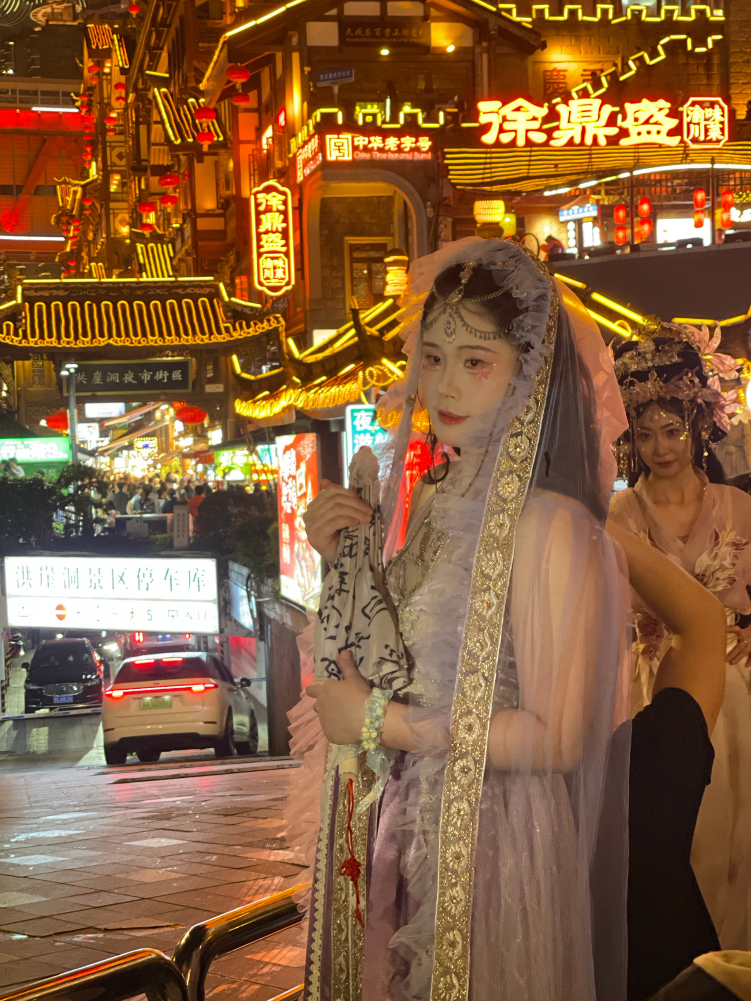 The image depicts a nighttime street scene in Hongyadong, Yuzhong District, Chongqing, China. In the immediate foreground, two East Asian females are visible, dressed in elaborate traditional Chinese-…read more