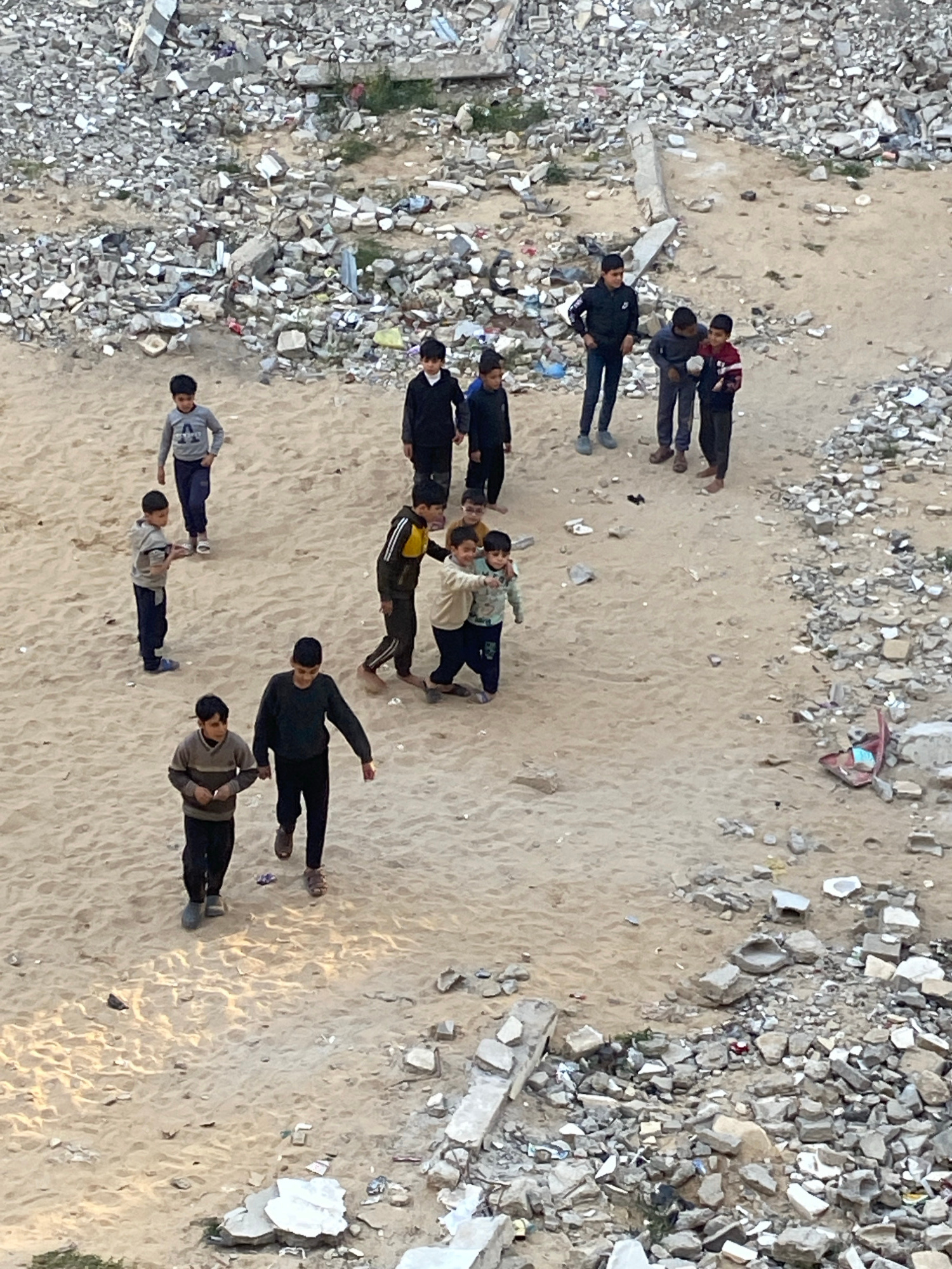 The image depicts a group of children lying on a sandy area amidst rubble and debris. There are approximately 13 children visible, most of whom are lying down. They appear to be in an area with signif…read more