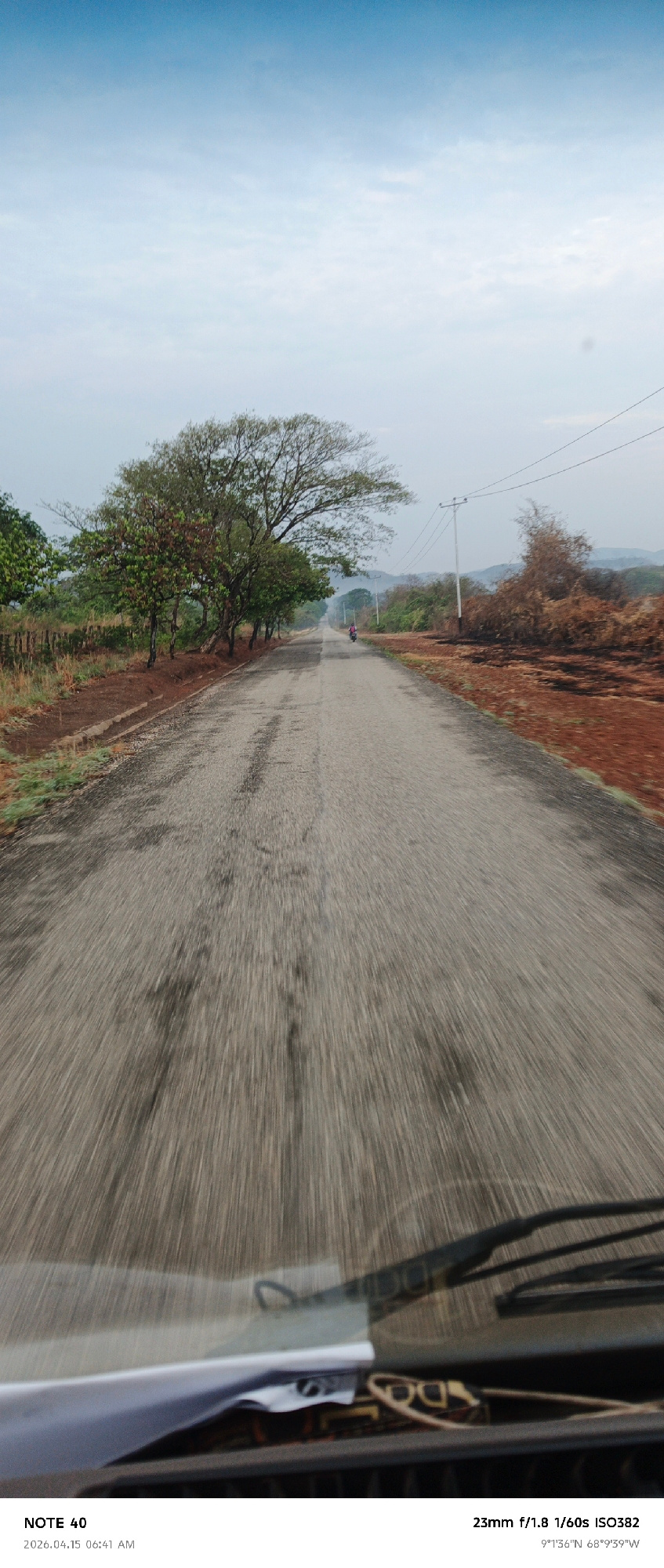The image is a point-of-view shot from inside a vehicle traveling on a rural road, indicating motion blur. The sky is visible in the upper portion of the image, transitioning from a bright blue at the…read more