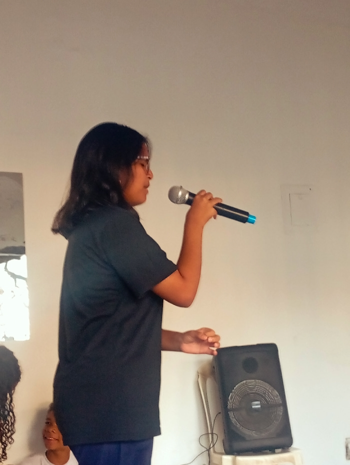 This image depicts an indoor scene in Juan Griego, Venezuela. A young female, positioned slightly off-center to the left and viewed from her right side, is holding a silver and black microphone with a…read more