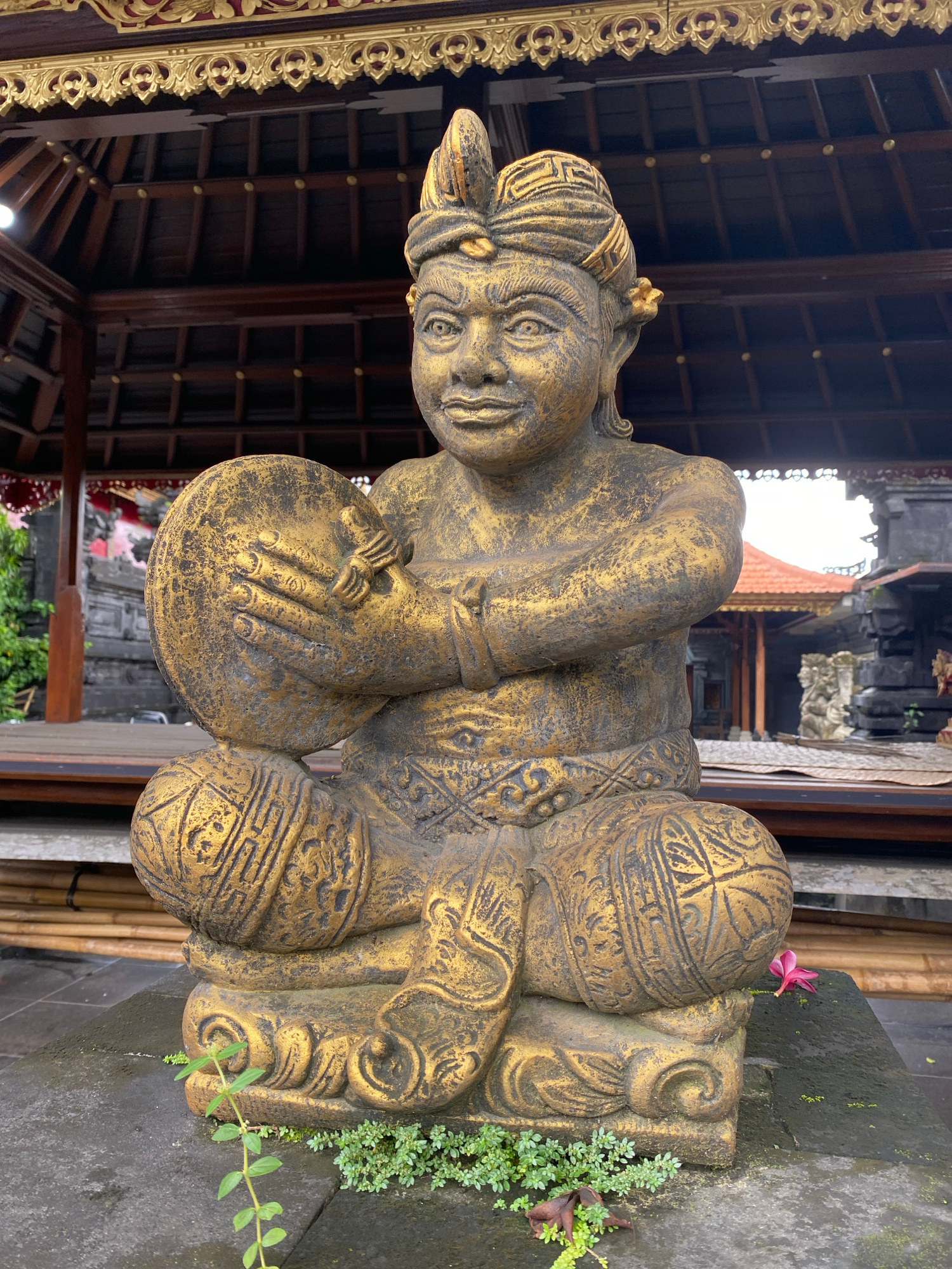 The media file displays a weathered golden stone statue, likely depicting a male figure, situated within a traditional Balinese architectural setting in Kuta Selatan, Indonesia. The statue is shown in…read more