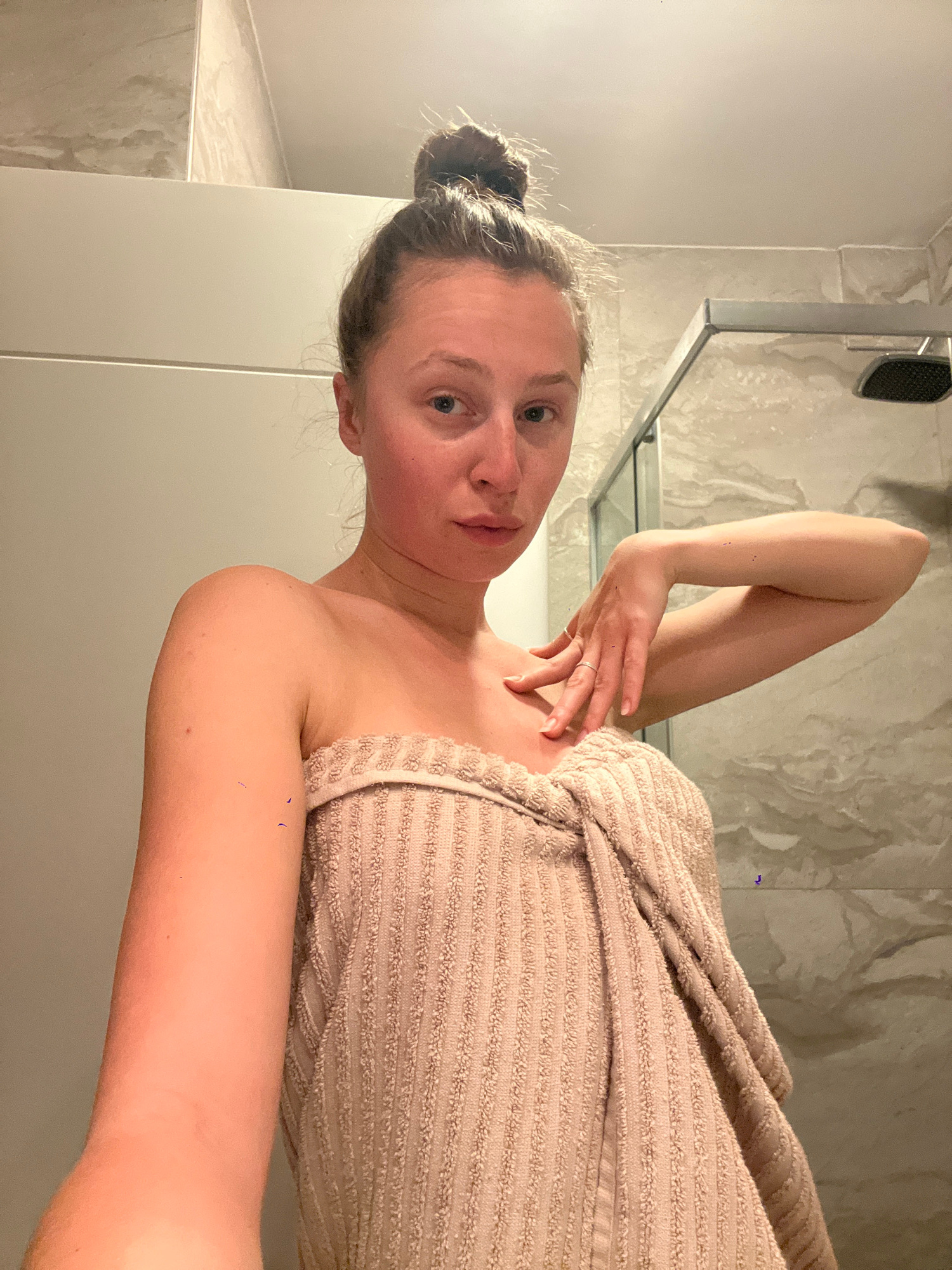 A woman stands in a bathroom, wrapped in a beige towel, with her hair pulled up in a bun. She is holding her arm up, with her hand near her neck. The bathroom appears to have a modern design with marb…read more