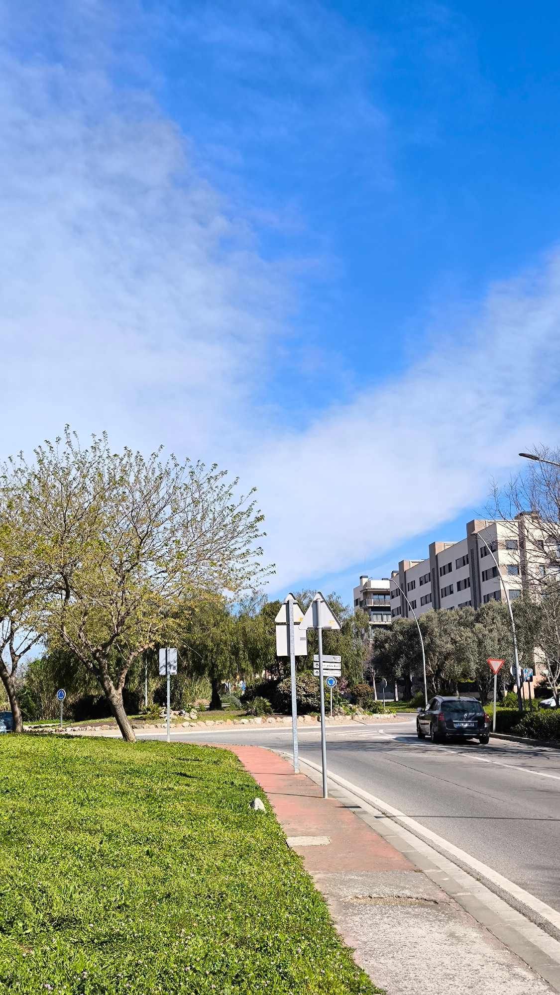 A daytime, eye-level shot depicts an intersection in Ripollet, Spain. The sky is mostly blue with scattered white clouds. A two-lane road is visible with a dark-colored hatchback car driving in the ri…read more
