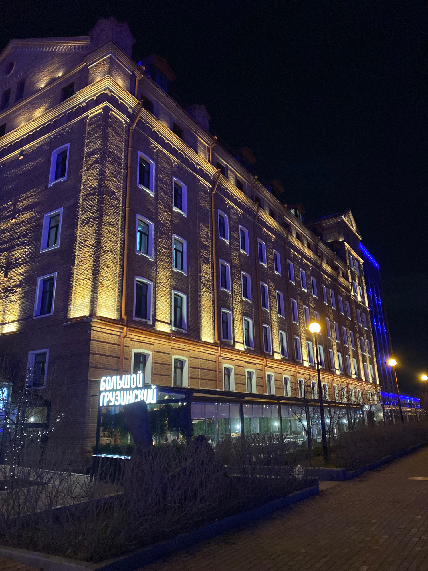 The image captures the facade of the "Bolshoi Gruzinsky" restaurant in Yekaterinburg, Russia, at night. The building is illuminated with warm, golden lights accentuating its brick texture and architec…read more