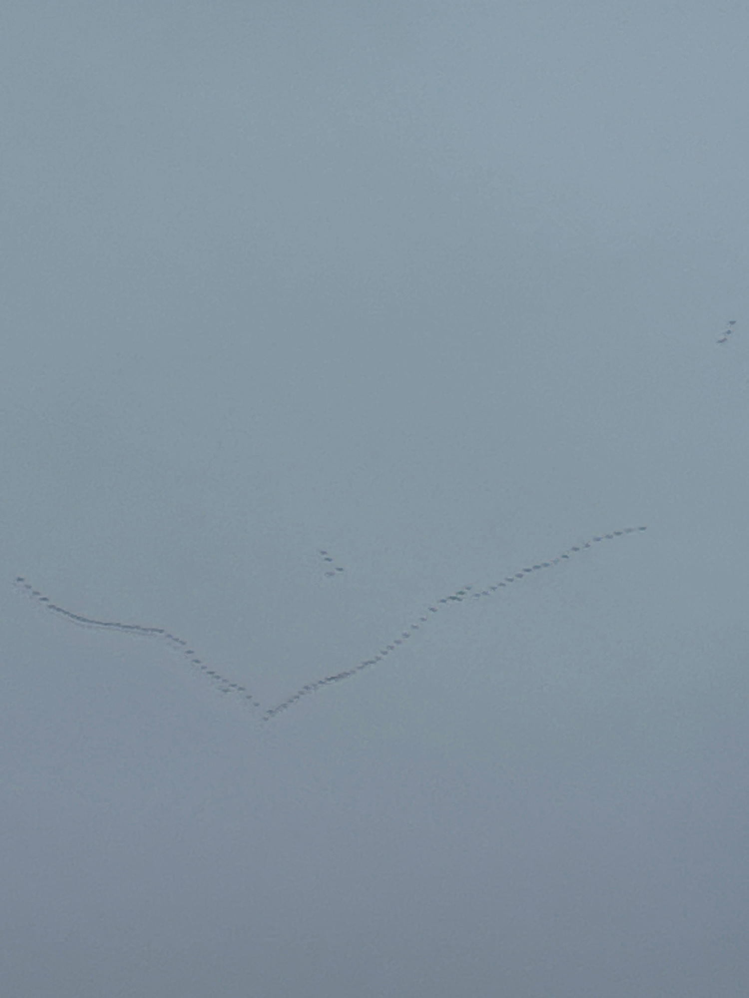 The image shows a pale blue, overcast sky. A formation of birds is flying diagonally across the frame, from the upper right to the lower right. The formation is initially a tight, single line, then it…read more