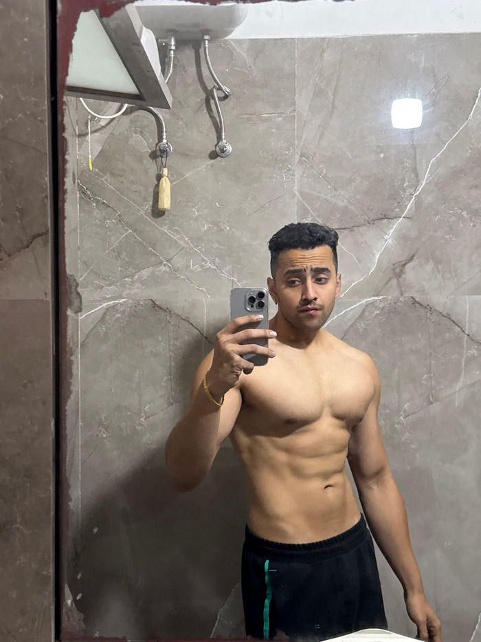 A shirtless, muscular man takes a selfie in a bathroom mirror. He has short, dark hair and is wearing black shorts with a green stripe. The bathroom has gray marble walls and a sink with exposed pipes…read more
