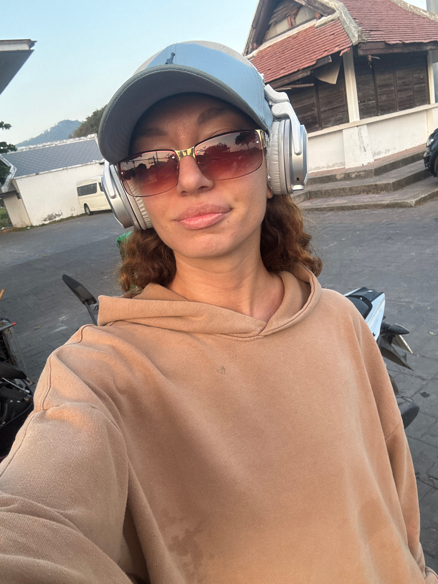 A woman wearing a light blue cap, sunglasses, and headphones is sitting on a motorcycle. She is wearing a light brown hoodie. The background shows buildings and a road in Baan Chaweng, Thailand.