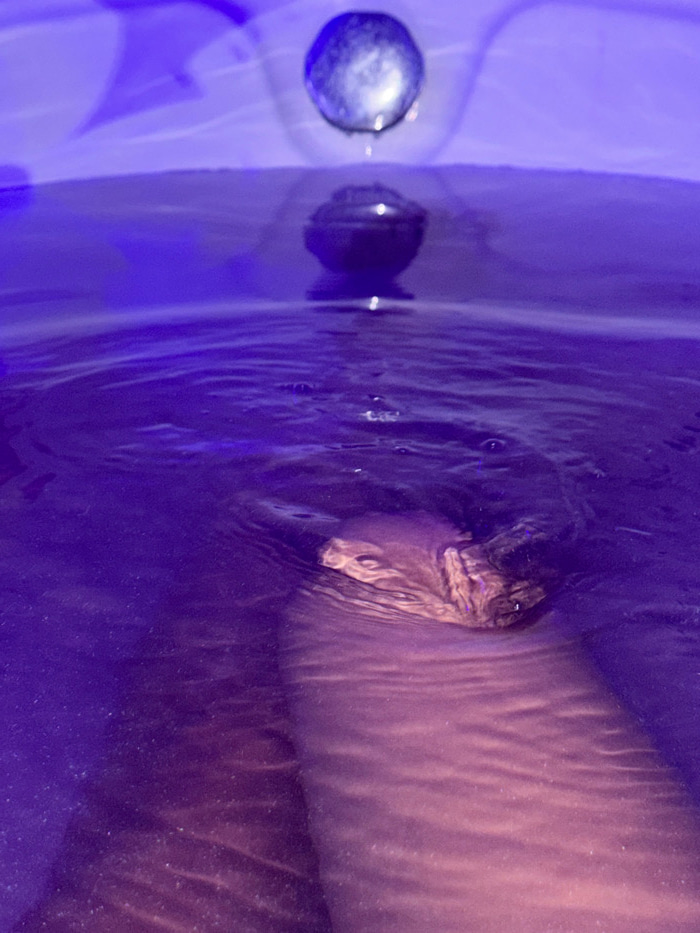 The image presents a low-angle, close-up perspective within a bathtub filled with purple-tinted water. A metallic, spherical faucet spout is visible at the top center, with a water droplet actively su…read more